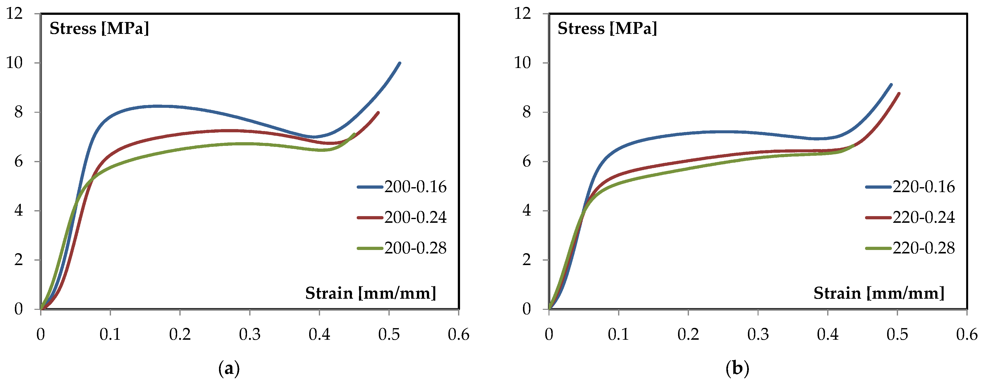 Figure 12a,b report the families of curves for the two extrusion temperatures, while the subsequent discussion focuses on the characteristic regions of the curves and on how layer height modulates stiffness, first-collapse stress, and post-collapse evolution.
