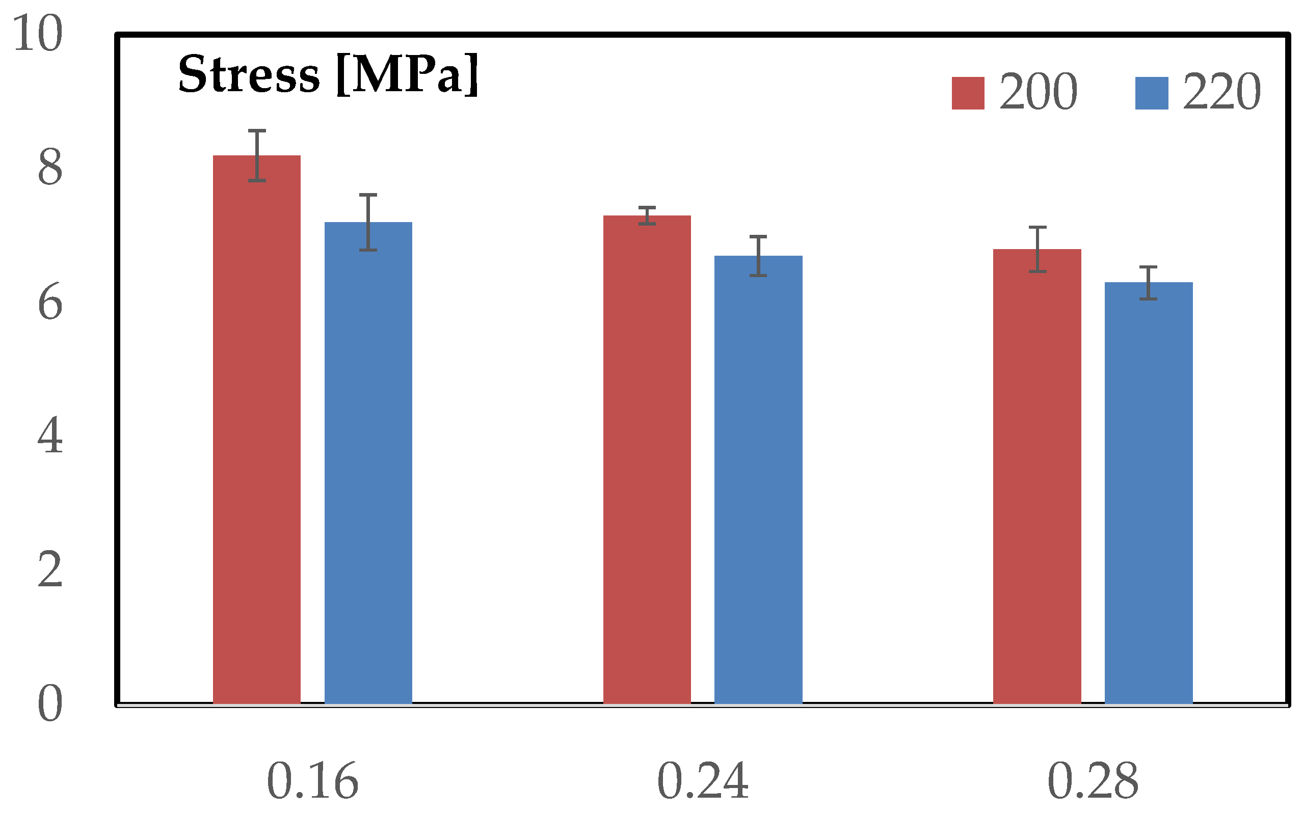 A second clear trend emerging from the histogram is the effect of extrusion temperature. For every layer height, the bars corresponding to 220 °C lie below those at 200 °C, indicating a uniform reduction in collapse resistance when the extrusion temperature is increased. This downward shift is modest but systematic and mirrors the behavior seen in the curve families: temperature affects the magnitude of the collapse stress but does not alter the ordering imposed by layer height.