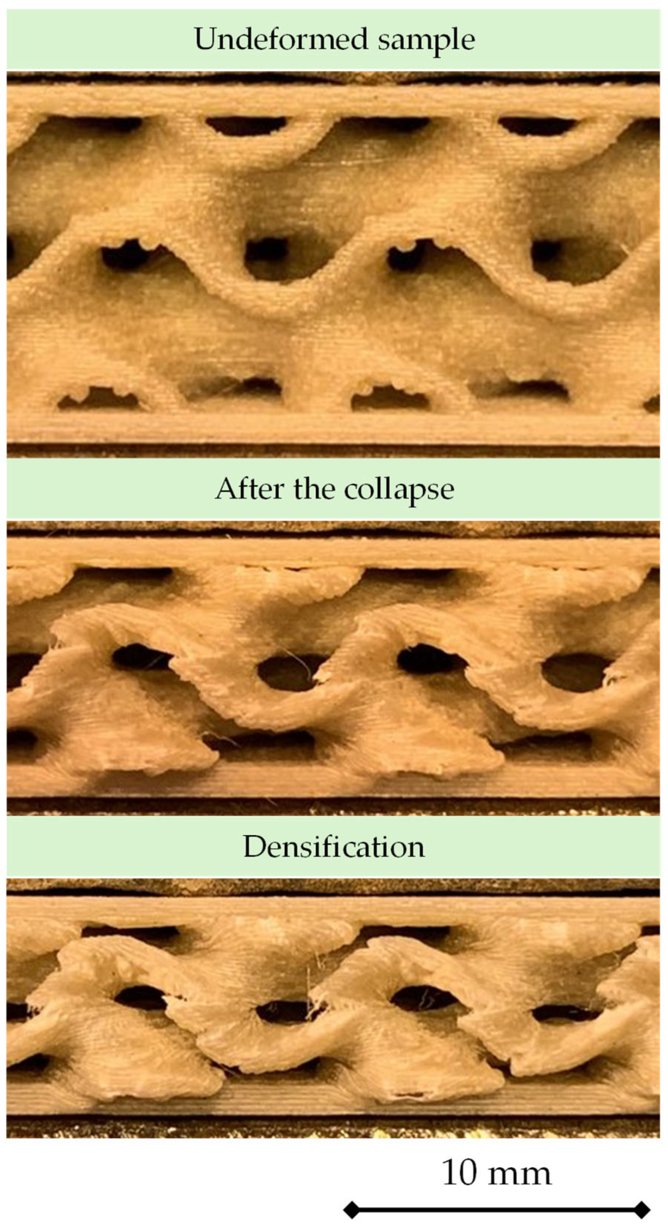 Taken together, the compressive behavior reflects the characteristic mode of deformation of gyroid architectures. The absence of discrete struts and the presence of continuous curvature promote stable wall folding and early densification, avoiding catastrophic collapse and ensuring a gradual redistribution of load. The clear influence of layer height, combined with the moderate effect of temperature, indicates that geometric fidelity of the walls, rather than interlayer adhesion, governs compressive performance.