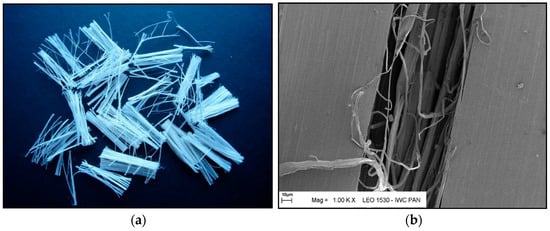 Polypropylene fibres “F” (Fibrofor Fibre High Grade 190): (a) photo without magnification; (b) SEM photo.