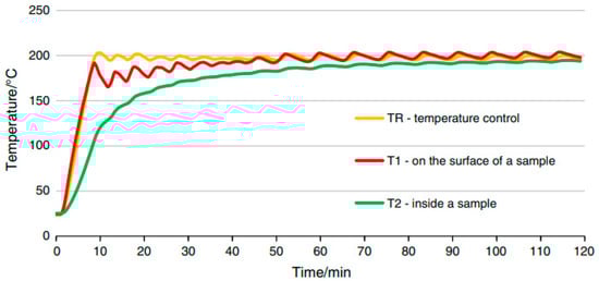 To measure temperature during the heat treatment process, three thermocouples were used: a control thermocouple (TR) measuring the furnace temperature and two thermocouples measuring the temperature on the sample (T1, T2). Thermocouple T1 was attached to the surface of the sample, while thermocouple T2 was placed inside a drilled channel—its end positioned halfway through the thickness of the sample. At each temperature, a batch of samples intended for testing was heated in the furnace, along with an additional sample on which the temperature was measured using thermocouples T1 and T2. The procedure was carried out in accordance with the guidelines of standard [] PN-EN 1991-1-2 Eurocode 1: Actions on structures, Part 1-2: Actions on structures during fire (Polish Committee for Standardization, Warsaw, 1991). The samples were heated until the thermocouples reached the target temperature during the time of ca. 120 min. After the temperatures on the thermocouples stabilised, the set temperature was maintained for an additional 30 min. Each time after heating, the furnace was turned off and cooled down to a safe temperature (approximately 100 °C); then, the furnace was opened and the samples were allowed to cool for about 24 h until they reached room temperature (20 °C).