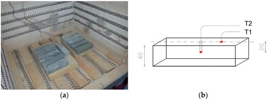 Arrangement of measuring thermocouples in a sample with nominal dimensions of 40 × 40 × 160 mm: (a) view of the sample with thermocouples attached; (b) diagram of the arrangement of thermocouples in the sample.