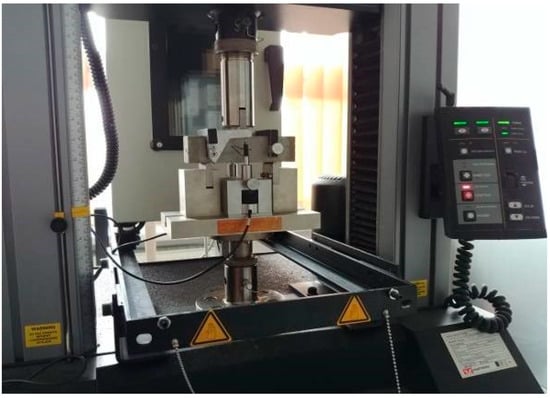 Optimisation tests—tensile strength tests were conducted on “figure-eight”-shaped specimens. The tensile strength determination was carried out according to standard [] PN-85 B-04500: Construction mortars—Testing of physical and strength characteristics. The INSTRON 5567 testing machine with a measurement range of 0–30 kN was equipped with curved grips for holding the figure-eight specimens (Figure 8). The figure-eight specimens for testing were produced using special removable steel moulds that met the standard requirements.