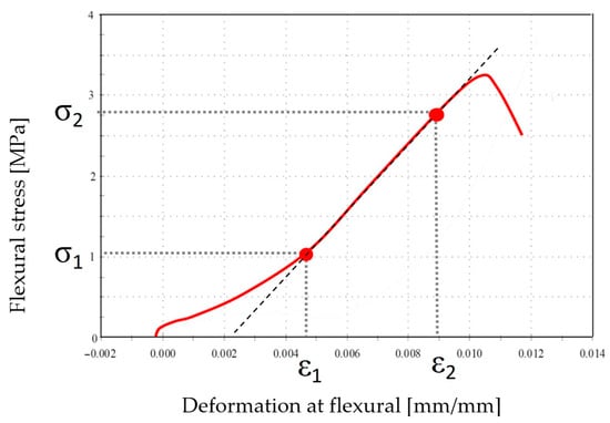 Stress−strain relationship obtained during the flexural test (red line—actual measurement result, dashed line—stress-strain curve in the elastic range, where Hooke’s law applies).