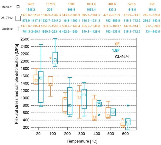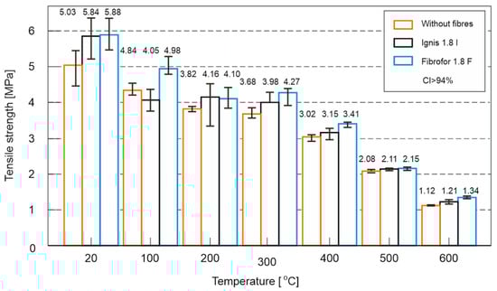 In the temperature range of 200–400 °C, a clearly beneficial effect of the fibres was observed. Both Ignis and Fibrofor increased strength compared to the reference samples, with Fibrofor being more effective, especially at 300 °C (+16%) and 400 °C (+13%). In contrast, the corresponding increases for Ignis fibres were lower: 300 °C (+8.5%) and 400 °C (+4.5%).