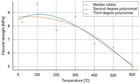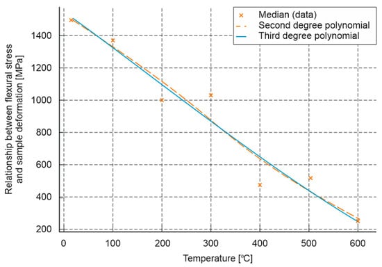 It should be noted that the use of this type of approximation is empirical, and its aim is not to directly replicate the physical phenomena occurring in the material, but rather to provide an approximate description of the trend of changes based on the obtained measurement results. In materials research, particularly regarding changes in mechanical properties as a function of temperature, a nonlinear behaviour of the curves is often observed. For this reason, polynomial functions are commonly used for local interpolation or extrapolation of data, allowing the determination of intermediate values, e.g., within a temperature range where no measurement was taken. In this study, polynomial models were chosen as a compromise between simplicity of notation and sufficient accuracy in replicating the experimental measurement points (the coefficient of determination, R2, for the third-degree model exceeds 0.98). The analysed functions accurately reflect the downward trend in strength with increasing temperature, as well as local deviations in lower temperature ranges, which confirms their usefulness for approximate assessment of parameters after failure or under operating conditions. It should also be emphasised that the applied model is descriptive (empirical) rather than predictive in a physical sense—it does not directly reflect the mechanisms of material structure degradation but allows for their quantitative approximation within the investigated temperature range.