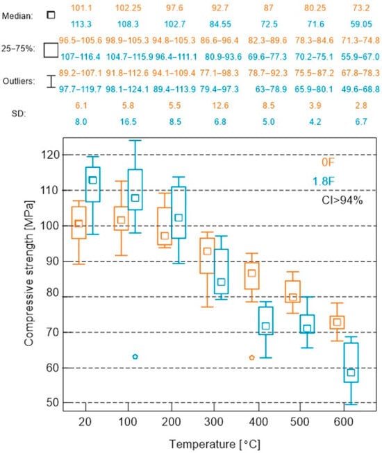 In the ready-mix concrete industry, many composites can be found that meet the first criterion. Thanks to the use of special additives in their production, these composites can operate reliably at temperatures reaching up to 1500 °C. A common feature of these materials, however, is the necessity of gradually introducing them to high-temperature conditions. During the successive stages of these processes, transformations occurring within the composites, lasting up to 160 h, ensure their safe operation thereafter [,,]. Although the temperatures affecting composites during emergency fires are lower, their rapid increases make it still difficult to design cementitious composites that would be completely resistant to such impacts.