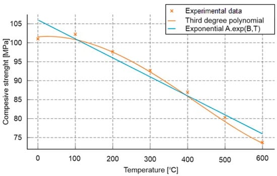 The resulting model (Figure 13) accurately reflects the initial slight increase in strength up to 100 °C, followed by a systematic decrease with increasing temperature, confirming its usefulness for the approximate assessment of material degradation under fire conditions.