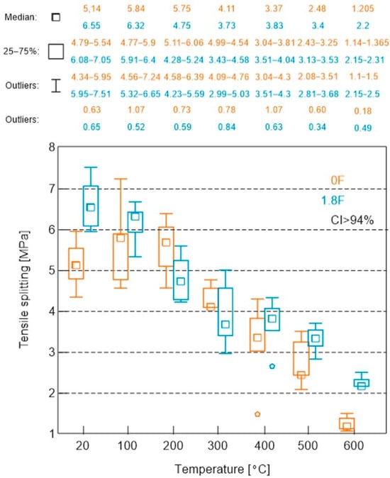 In terms of tensile strength under flexural and splitting for both samples with and without polypropylene fibre addition, an increasing trend in this parameter was observed up to 100 °C (from 8.3 MPa to 9.6 MPa without fibres and from 10.6 MPa to 12.5 MPa with fibres), followed by an almost linear decrease down to 600 °C, reaching values of approximately 5.1 MPa (without fibres) and 5.5 MPa (with fibres). The addition of polypropylene fibres had a beneficial effect on this tested parameter throughout the entire temperature range.