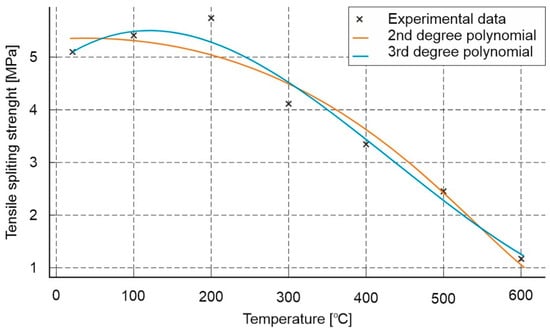 Based on the presented results of strength values as a function of temperature, a mathematical model was developed to enable an approximate assessment of parameters after exposure to high temperature. Among the tested relationships (2nd- and 3rd-degree polynomials and an exponential model), the best fit was obtained for the 3rd-degree polynomial, which had a coefficient of determination of R2 = 0.843.