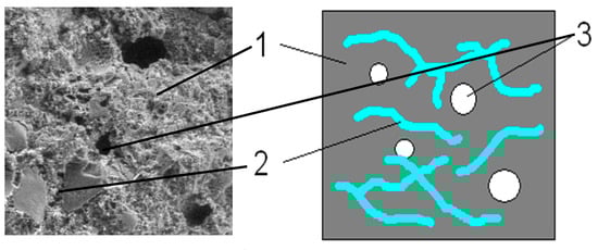 Diagram of the gradual melting of polypropylene fibres with increasing temperature: (a) tensile strength testing and local strengthening of the composite by the remnants of polypropylene fibres; (b) compressive strength testing and local weakening of the structure due to phase discontinuities caused also by the melting of fibres. Legend: 1—cement paste; 2—voids formed as a result of fibre melting—phase discontinuities causing local tensile stresses during compressive strength testing; 3—voids formed due to water evaporation; 4—parts of fibres not melted that function as dispersed reinforcement which is beneficial in terms of tensile strength testing. Red arrows indicate locally occurring tensile stresses.