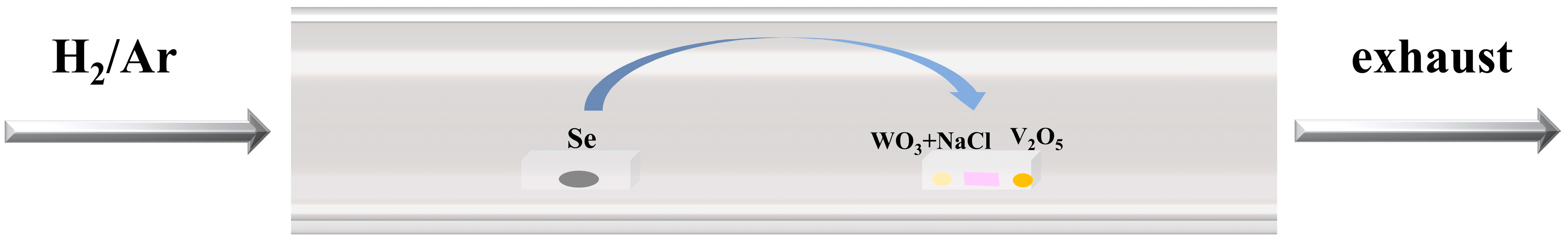 - Luo, X.M.; Jiao, Y.H.; Li, H.; Liu, Q.; Liu, J.F.; Wang, M.W.; Liu, Y. Impact of Carrier Gas Flow Rate on the Synthesis of Monolayer WSe2 via Hydrogen-Assisted Chemical Vapor Deposition. Materials 2024, 17, 2190. [Google Scholar] [CrossRef]