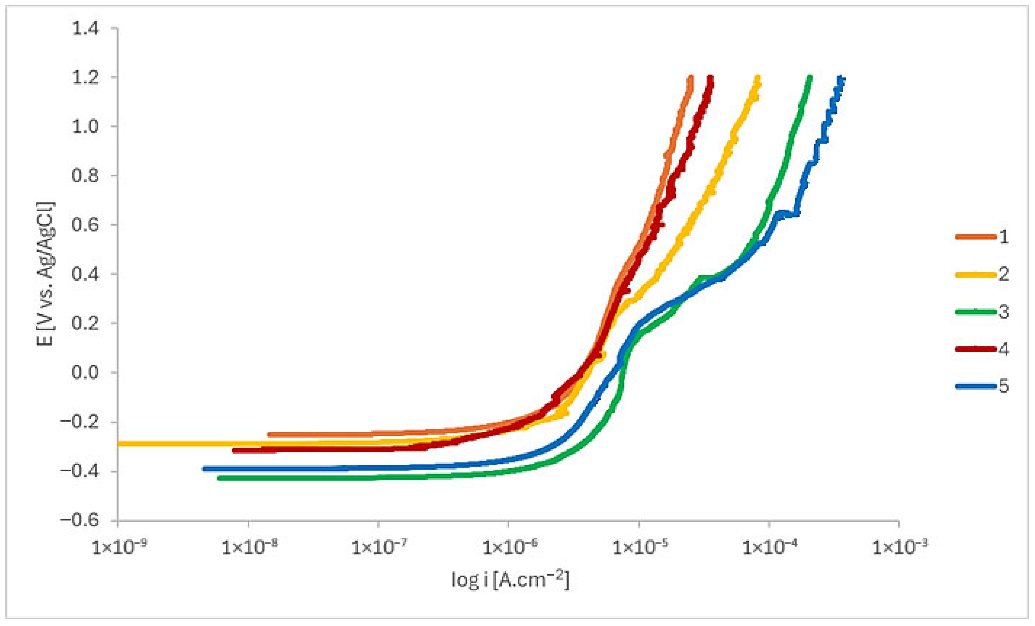 - Jáquez-Muñoz, J.M.; Gaona-Tiburcio, C.; Baltazar-Zamora, M.A.; Méndez-Ramírez, C.T.; Estupinán-López, F.; Bautista-Margulis, R.G.; Cuevas-Rodríguez, J.; Flores-De los Ríos, J.P.; Almeraya-Calderón, F. Corrosion of Titanium Alloys Anodized Using Electrochemical Techniques. Metals 2023, 13, 476. [Google Scholar] [CrossRef]
