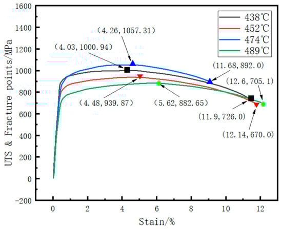 The hot-rolled steel coils were though-water cooled to coiling temperatures of 438 °C, 452 °C, 474 °C and 489 °C, respectively. After cooling to room temperature, samples were taken for tensile testing to obtain the stress–strain curves and hole expansion experiment. The ultimate tensile strength (UTS) and the stress–strain values at complete fracture for each sample are shown in Figure 2.