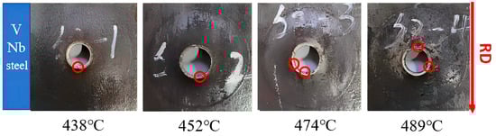 The appearance of the specimens after hole expansion were shown in Figure 3. In most tested samples, cracking occurred primarily parallel to the rolling direction, as the red circles in Figure 3. For the V-Nb steel, cracking in both the perpendicular and parallel directions reflect the influence of microstructure evolution—associated with the rolling direction—on crack propagation. As shown in Table 3, the HER of the V-Nb steel first increases and then decreases with a rise in the isothermal transformation temperature.
