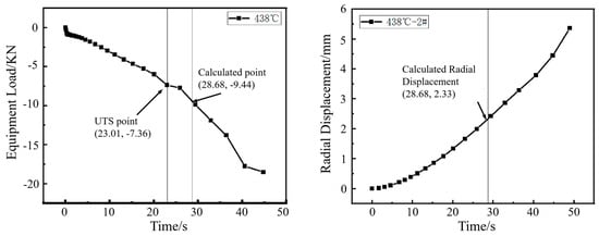Load–time curve from the hole expansion test and simulated radial displacement for the specimen coiled at 438 °C.