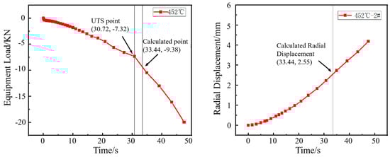 Load–time curve from the hole expansion test and simulated radial displacement for the specimen coiled at 452 °C.