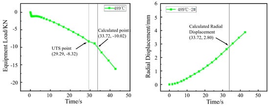 Load–time curve from the hole expansion test and simulated radial displacement for the specimen coiled at 489 °C.