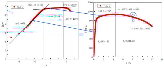 As shown in Figure 10, the determination of the strain hardening exponent (n) considers only the uniform hardening stage(n1) and excludes the post-uniform stage(n2). In reality, the hole expansion test continues until the hole edge completely fractures—meaning the post-uniform stage also contributes to the HER. As shown in Table 5, the n2 is 0.1014 for 474 °C which cannot be neglected. Conventional forming limit models based on the hardening exponent only account for the uniform deformation stage. Forming limit criteria can only predict the onset of the post-uniform stage but not the final fracture point, which explains the inaccuracy of n-based predictions. The strain hardening exponent reflects the behavior of the material in the uniform deformation regime and the relationship between stress and strain; the n-value dictates the capacity of the material for uniform plastic deformation. However, due to the inability to account for the nonlinear deformation in the post-uniform stage, methods relying solely on the n-value to predict the HER struggle to deliver accurate results.