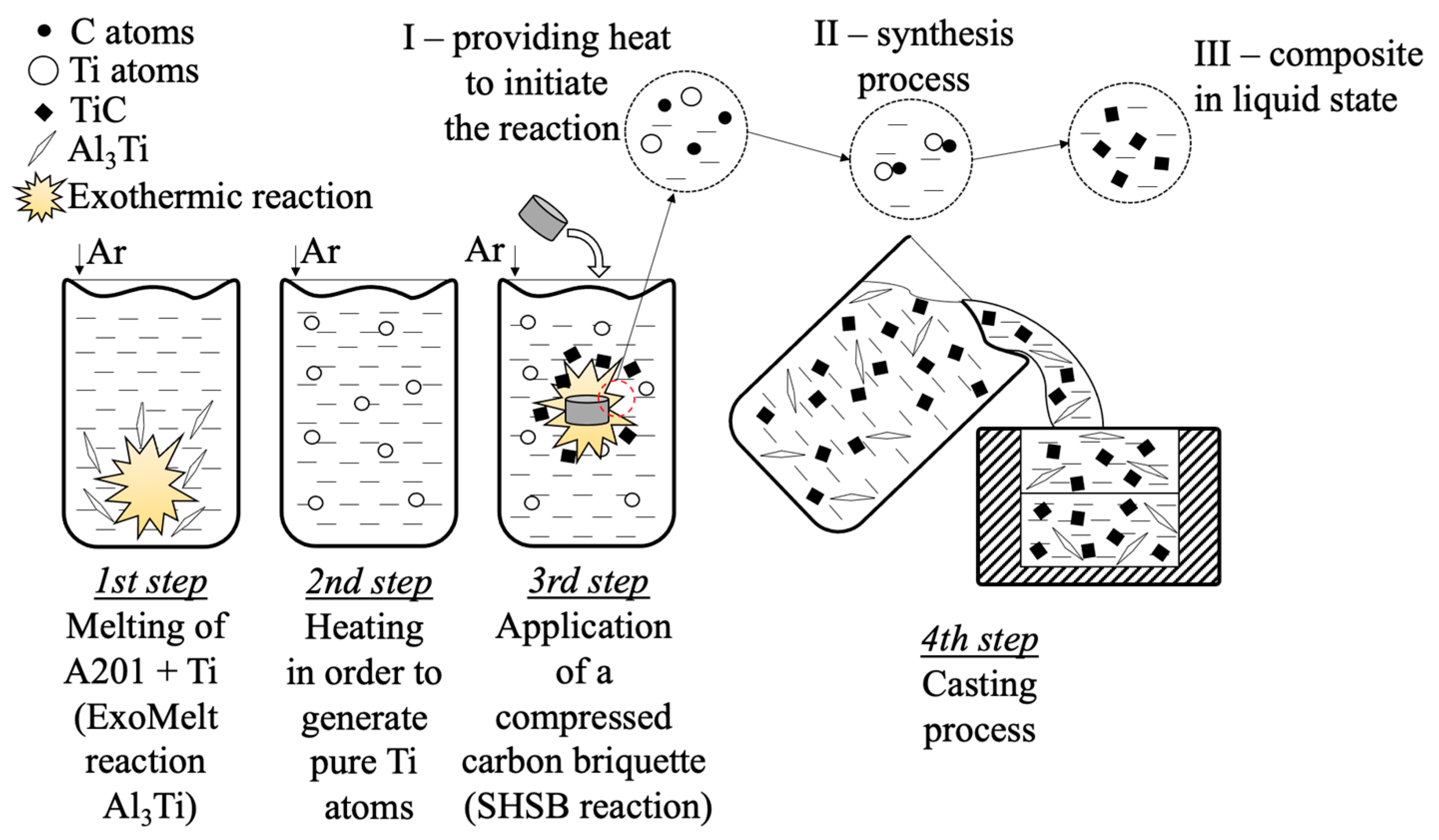 - Fraś, E.; Wierzbinski, S.; Janas, A.; López, H.F. Synthesis of Al–TiC in-situ Composites via SHSB Technology. In State of the Art in Cast Metal Matrix Composites in the Next Millennium; Rohatgi, P.K., Ed.; TMS–ASM International: Warrendale, PA, USA, 2000; pp. 69–79. [Google Scholar]