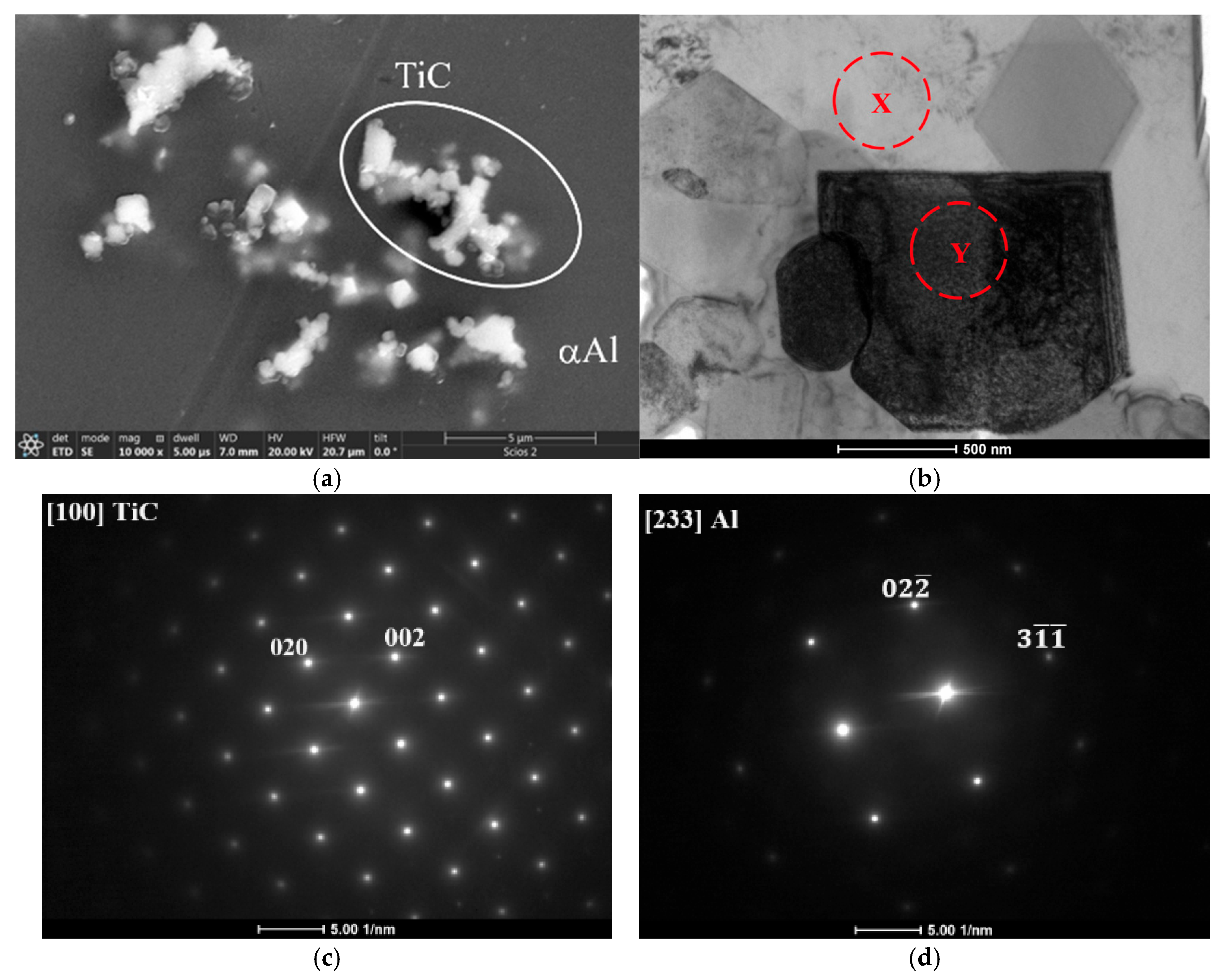 - Maziarz, W.; Wójcik, A.; Bobrowski, P.; Bigos, A.; Szymański, Ł.; Kurtyka, P.; Rylko, N.; Olejnik, E. SEM and TEM Studies on In-Situ Cast Al–TiC Composites. Mater. Trans. 2019, 60, 714–717. [Google Scholar] [CrossRef]