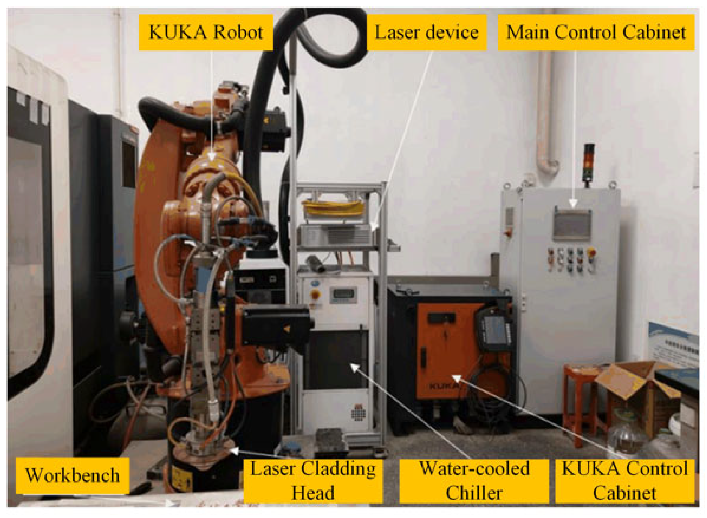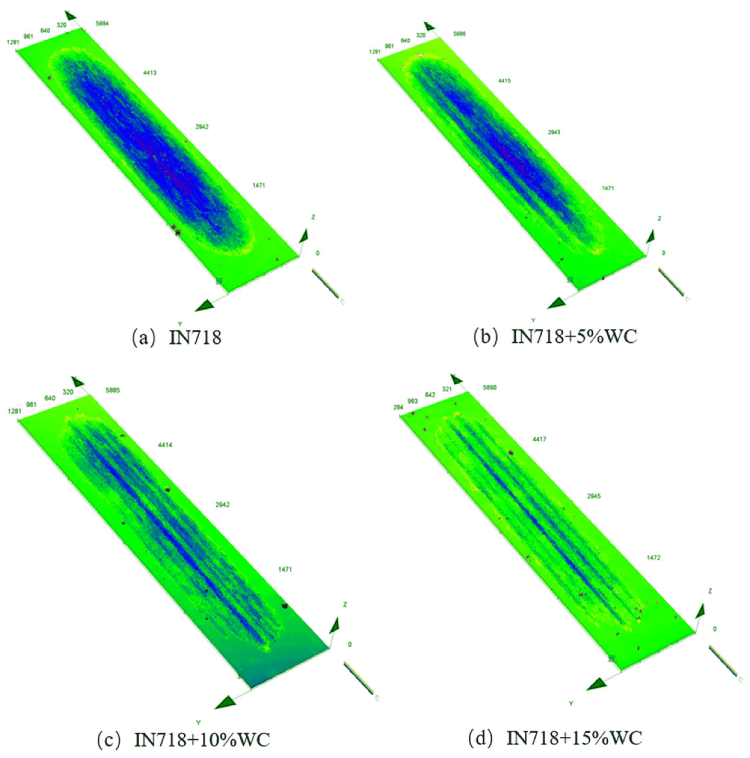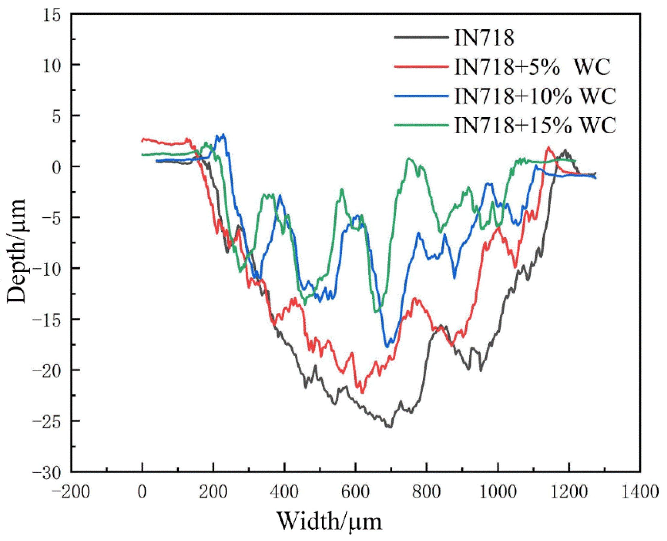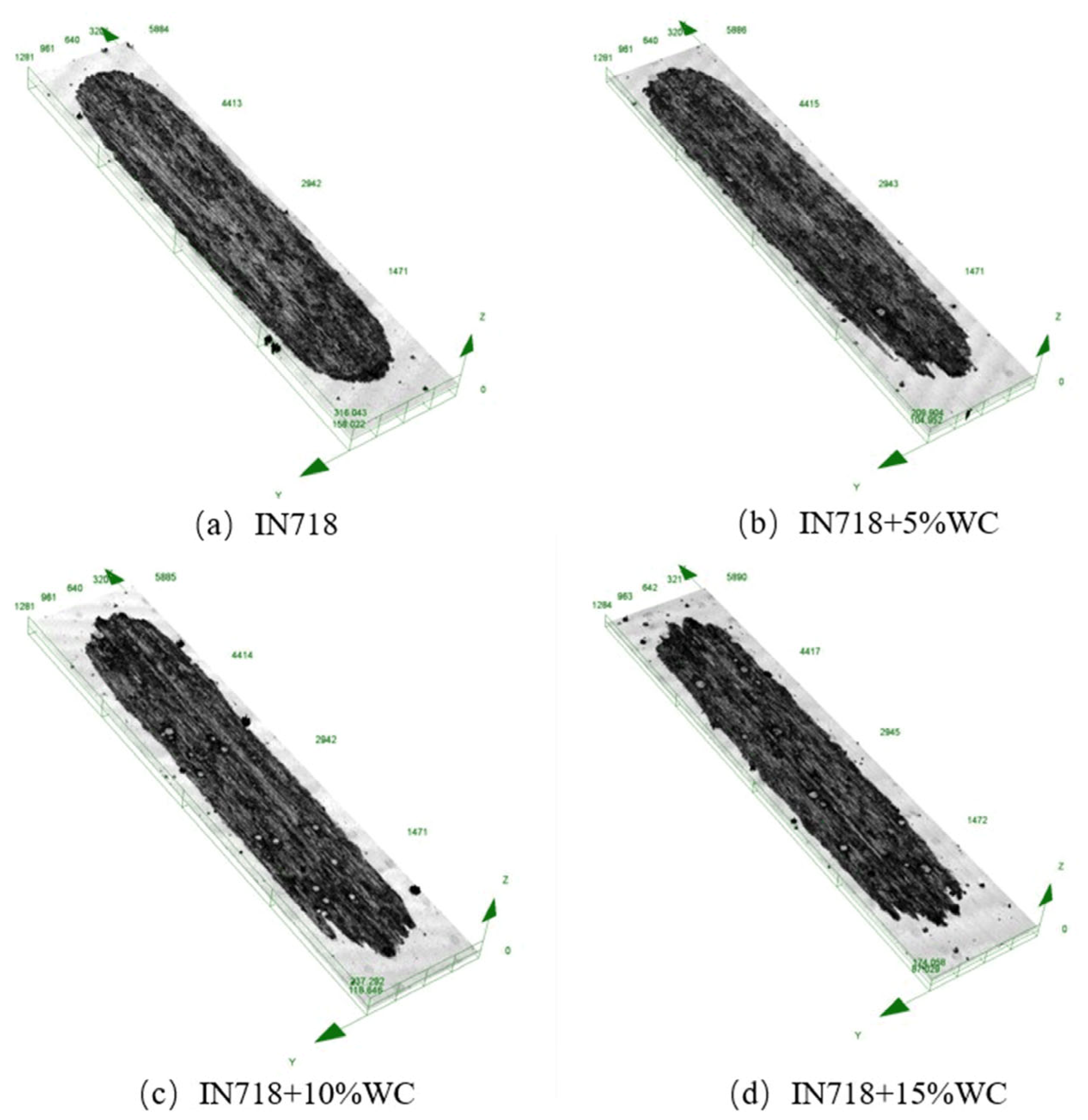 Figure 13. Among all materials, the substrate material EA4T steel exhibited the highest wear resistance, significantly outperforming IN718 steel in particular. As the WC content increased, the substrate’s wear resistance also gradually improved, reaching its peak at the highest WC content of 15%. Additionally, the wear width of the clad layer remained relatively stable around 900 μm despite increasing WC content. The clad layer depth exhibited a decreasing trend with rising WC content, diminishing from a maximum of 25 μm to 15 μm. As shown in