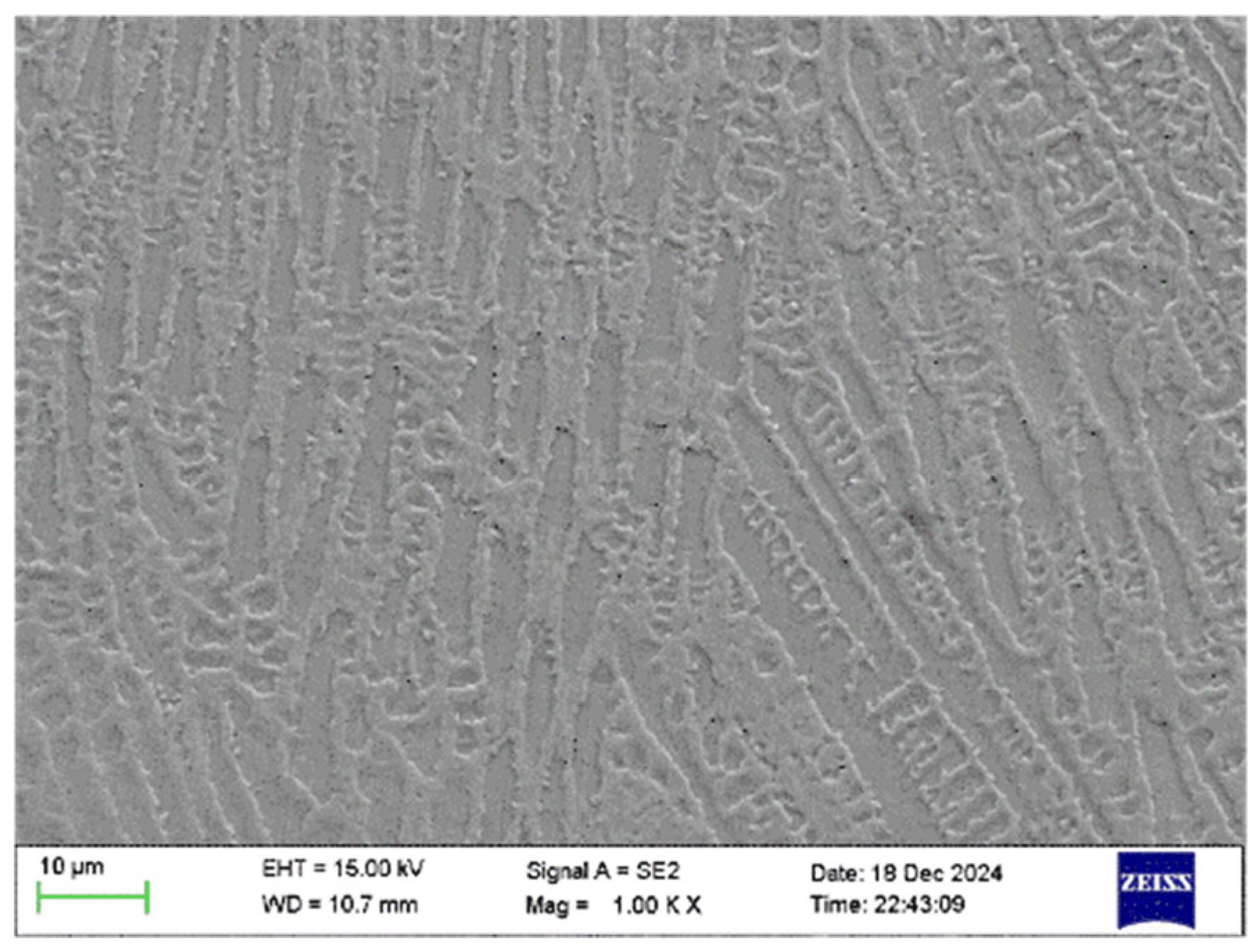 Figure 20b reveals a distinct textured pattern in the fracture surface, with grain orientations ranging from 45° to 135°. Additionally, certain banded structures resembling columnar crystal morphology were clearly visible at specific locations. To investigate whether these structures represent columnar crystals or are related to them, ImageJ software revealed an average width of 3.17 μm—consistent with the columnar crystal dimensions described earlier. This confirms that the structures depicted are columnar crystal formations. The growth direction of the columnar crystal structure shown in