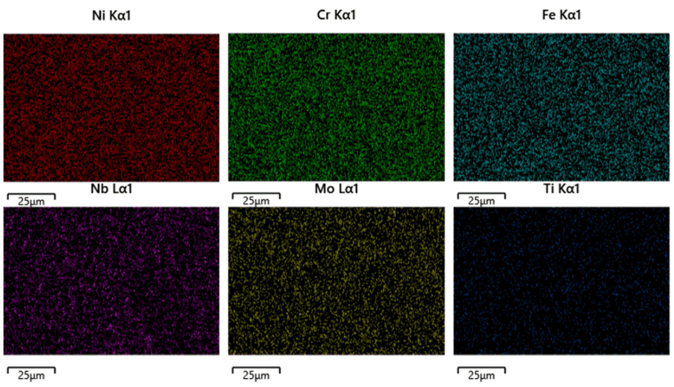 Corrosion-etched scanning results revealed that among the aforementioned elements, Ni, Cr, Fe, Mo, and Ti exhibited minimal segregation while Nb exhibited segregation patterns similar to the dendritic morphology observed via SEM. To further investigate the influence of dendritic growth on the segregation of these elements, points were selected in