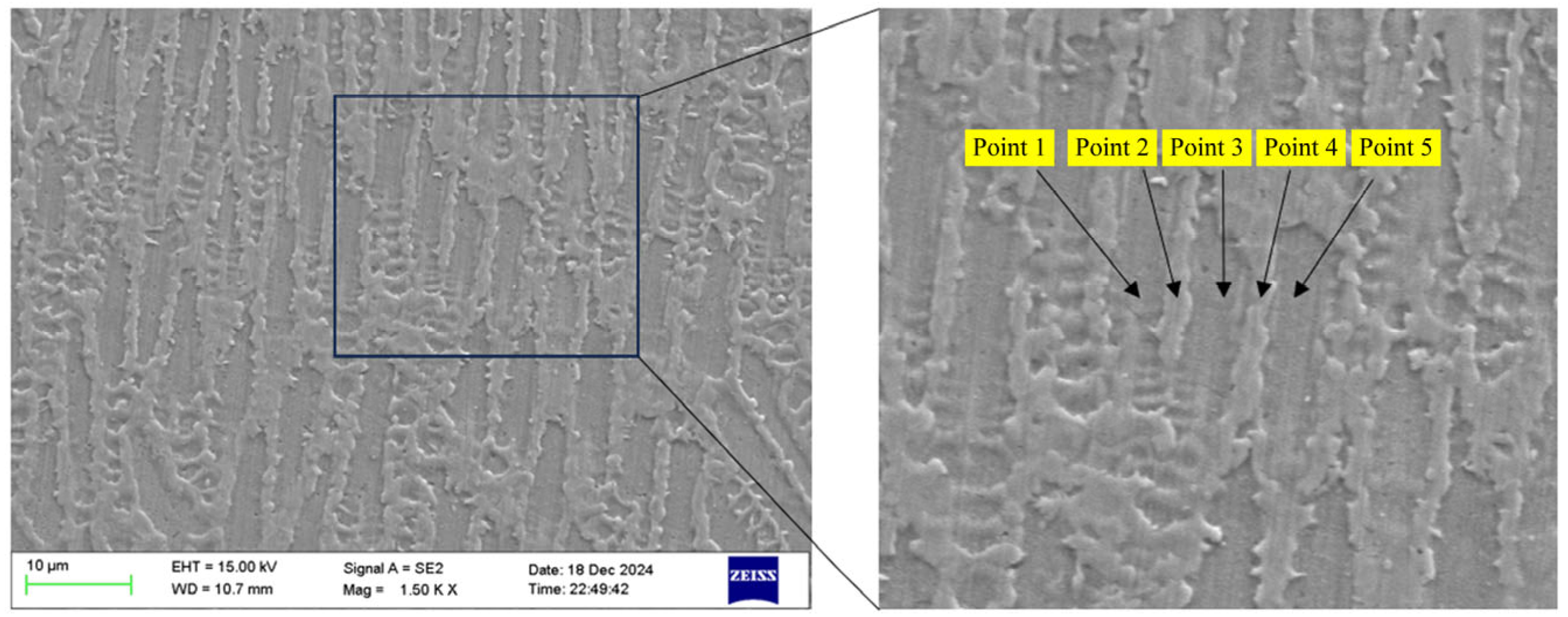 Figure 5 to analyze their elemental composition. Points 1, 3, and 5 are located within the columnar grain structure, while points 2 and 4 are situated in the precipitation structure within the columnar grain boundaries. The locations of the selected points are shown in