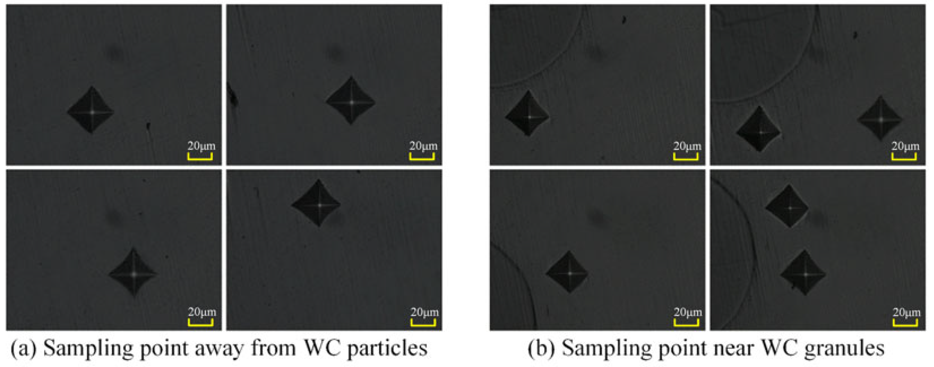Hardness measurements were conducted on each material according to the aforementioned test protocol. To obtain more accurate hardness values, five measurement points were selected for each material requiring hardness data, and the average hardness was calculated. For the hardness of the surrounding structure around WC particles, measurement points should be positioned as close as possible to the WC particles without making contact. The sampling points are illustrated in