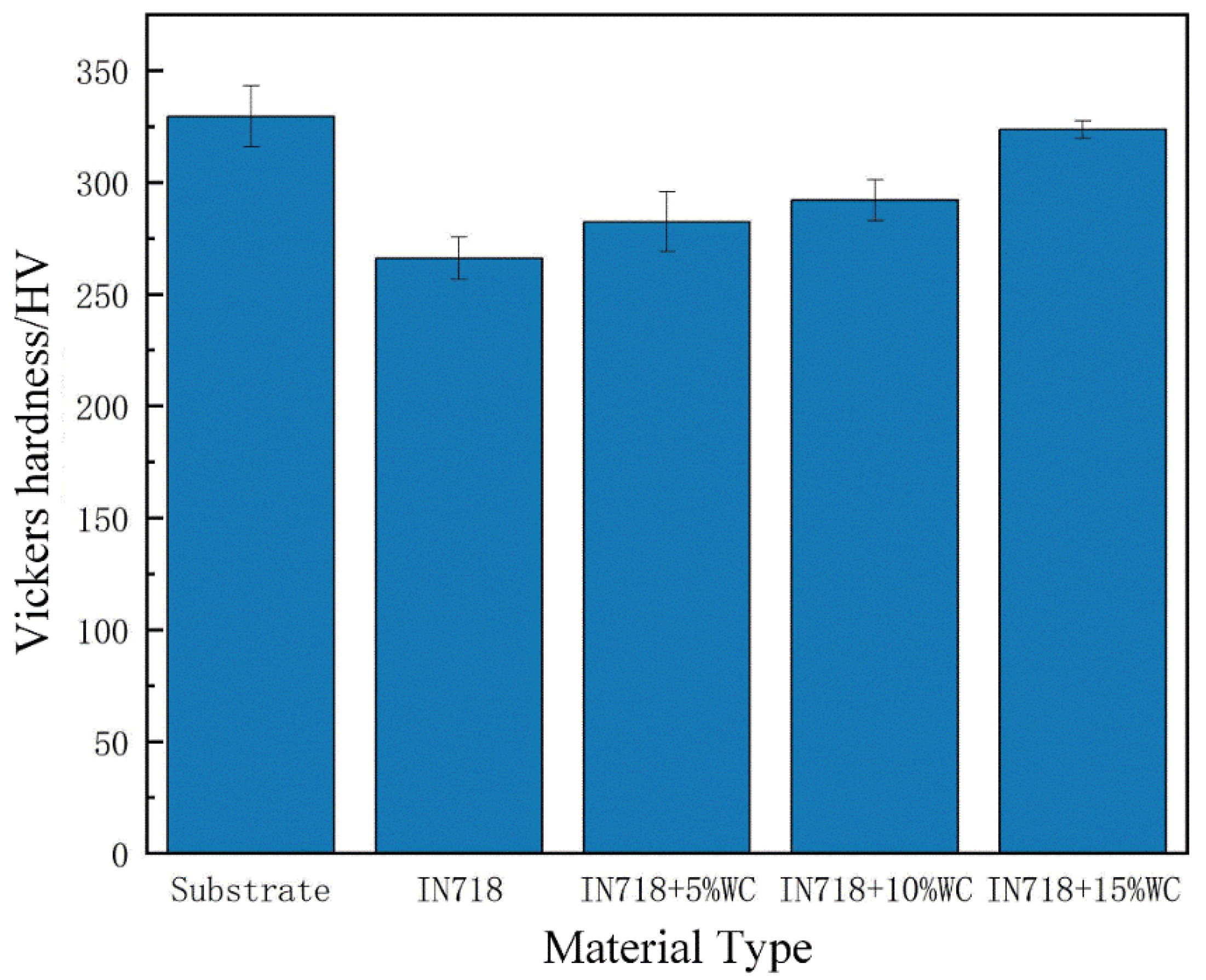 Figure 9. Significant hardness differences existed between the base material EA4T steel and the IN718 material. Measurements indicate that EA4T steel exhibited a hardness of 328.4 HV, while the laser cladding IN718 material achieved 262.8 HV. The hardness gradually increased with the addition of WC, rising from 282.9 HV to 324.8 HV. The maximum hardness was achieved at a WC mass fraction of 15%, which was essentially consistent with the hardness of the base material EA4T steel.