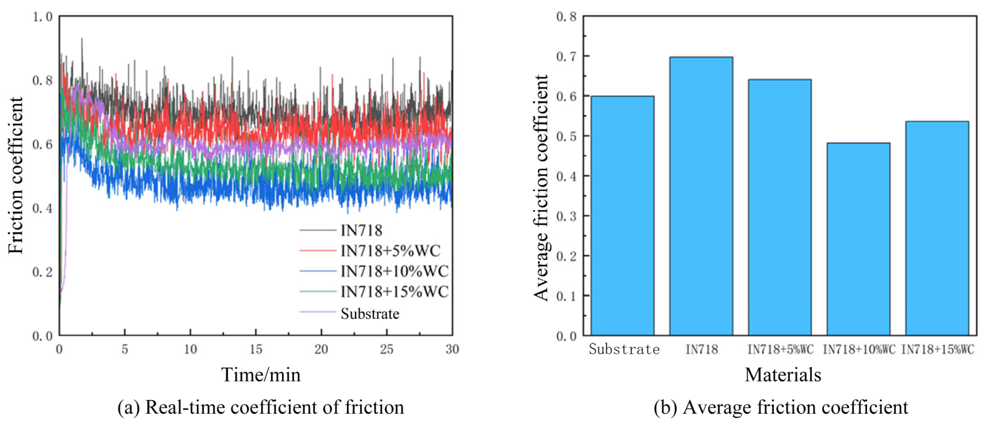 Figure 10, the coefficient of friction initially increased over time before decreasing and eventually stabilizing. The base material exhibited a lower friction coefficient compared to IN718. Testing revealed an average friction coefficient of 0.697 for the IN718 cladding layer. This coefficient gradually decreased with increasing WC content, reaching a minimum of 0.482 at a WC mass fraction of 10%. As WC content continued to increase, the average friction coefficient rose to 0.536. At a WC particle content of 5%, the insufficient particle quantity failed to form effective support within the cladding layer. Although the friction coefficient decreased relative to pure IN718 material, the substrate material remained the primary factor contributing to friction and wear. At 15% WC content, the relatively higher particle density impaired fluidity within the molten pool. This reduced fluidity readily led to stress concentration during cladding layer cooling, exacerbating wear. At a WC mass fraction of 10%, the optimal ratio ensured that smaller-radius WC particles fully melted and thoroughly mixed with the IN718 material, enhancing the wear resistance of the cladding layer. Additionally, heat caused the surfaces of larger-radius WC particles to partially dissolve, promoting material bonding. Finally, the thermal expansion coefficient is a critical factor in material bonding. The optimal ratio allows IN718 to compensate for stress concentrations caused by differing thermal expansion coefficients through plastic deformation. Conversely, higher WC content reduces the proportion of the base material, compromising its continuity and increasing susceptibility to stress concentration and micro-cracks, which adversely affect microstructural properties.