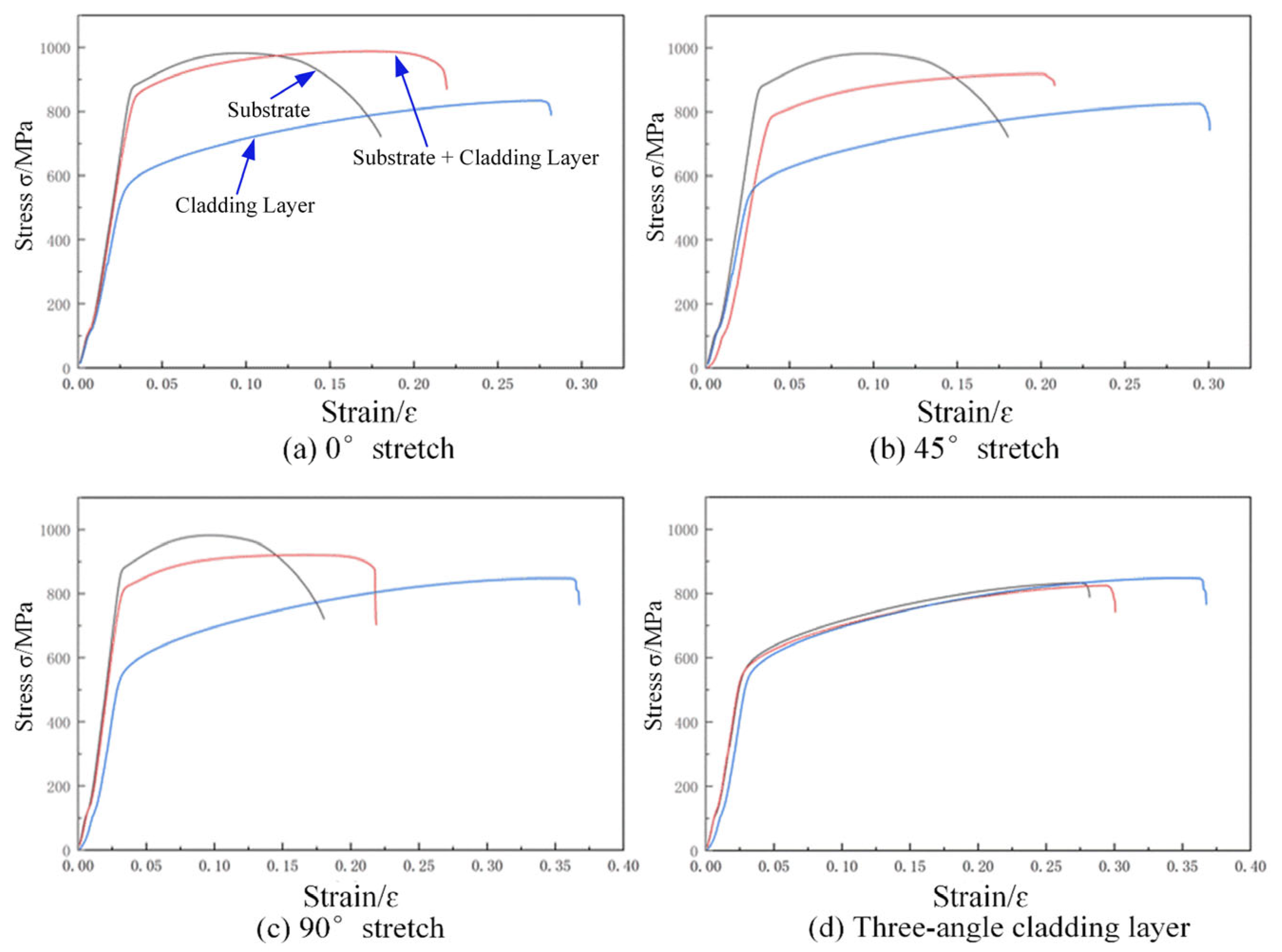 Figure 14. All stress–strain curves exhibited continuous and smooth behavior, indicating satisfactory cladding performance under the specified process parameters. No significant defects in the cladding layer or incomplete stress–strain curves resulting from suboptimal process parameters were observed. Preliminary analysis of stress–strain curves at different tensile angles indicates that the tensile strength of the substrate material is significantly higher than that of the cladding layer in various orientations. However, the cladding layer exhibited greater ductility compared to the substrate material.