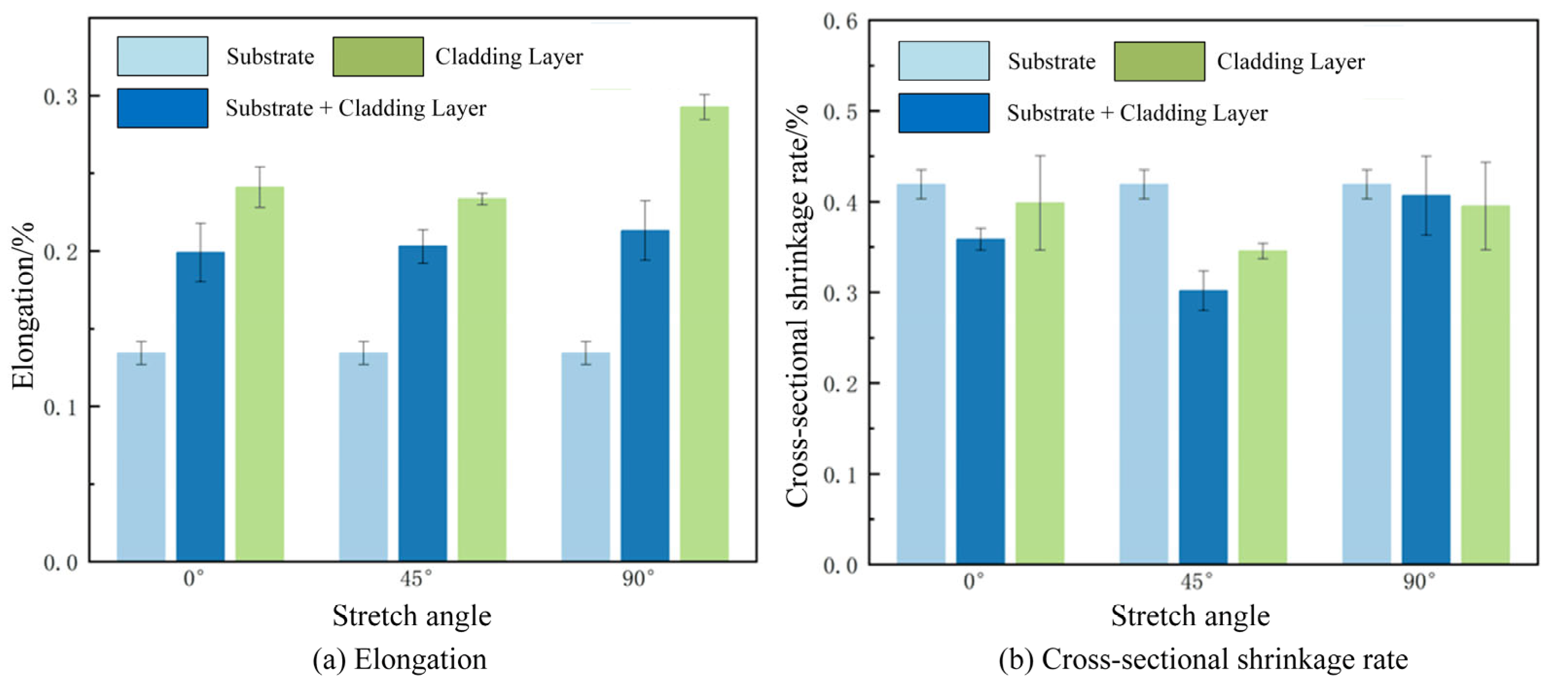 Figure 15a. The substrate + cladding layer composite and pure cladding layer exhibited different elongation values in various directions. Overall, the substrate showed significantly lower elongation than the cladding layer material. The elongation of the substrate + cladding layer composite was intermediate due to the combined effects of both the substrate and cladding layer materials. As the angle varied from 0° to 90°, the elongation of the substrate + cladding layer material was 0.18, 0.20, and 0.19, respectively. Given the isotropic properties of the substrate material, it is considered that the substrate material has a greater influence on the elongation of the substrate + cladding layer material, while the cladding layer at different angles plays a lesser role at this point. Since the pure cladding layer is not influenced by the substrate material, its elongation increases with angle, rising from 0.23 at 0° to 0.29 at 90°. This demonstrates that the loading angle significantly affects elongation, with the tensile direction perpendicular to the scanning speed direction being more conducive to material ductility.