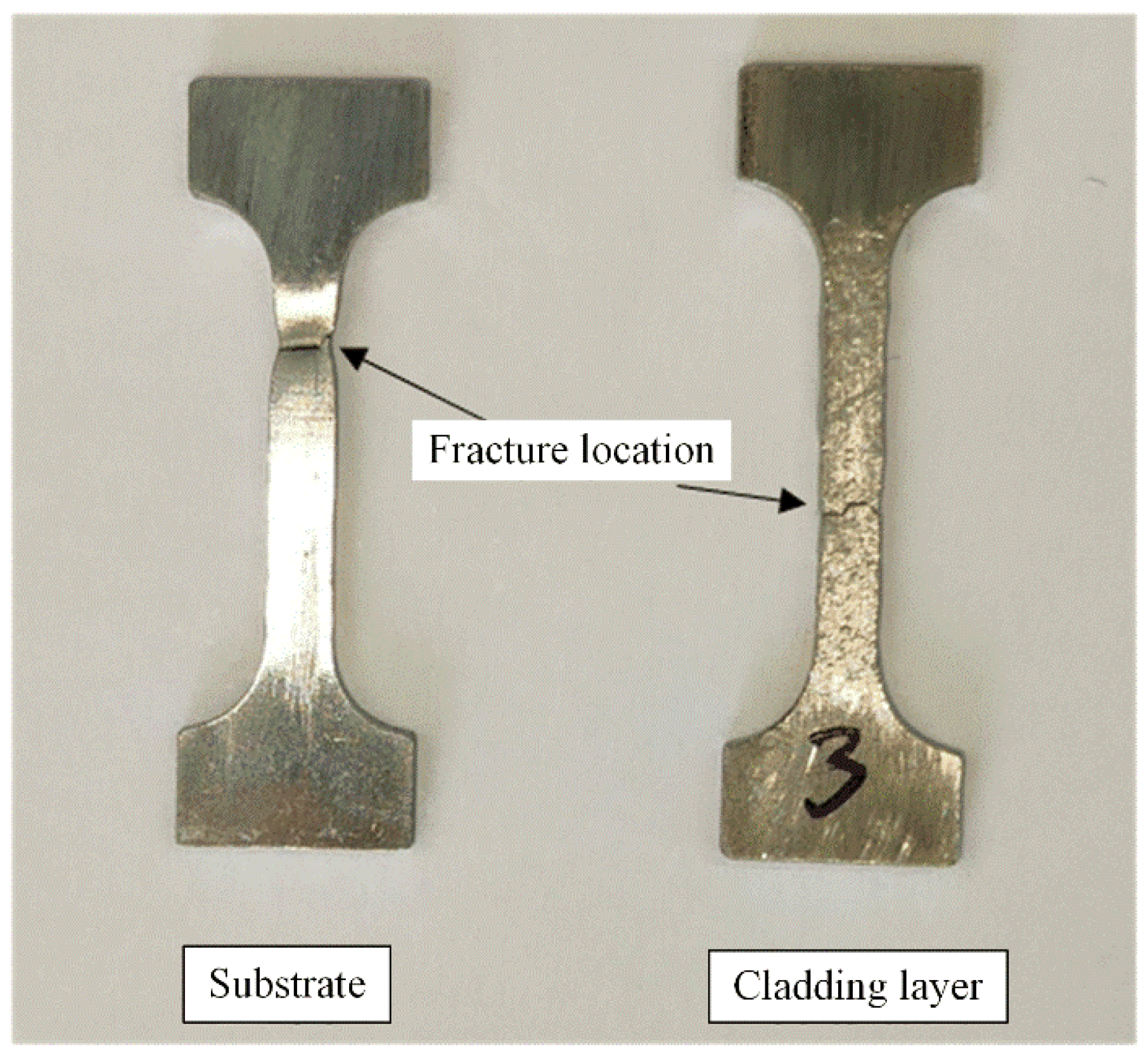Figure 16 displays the post-tensile state of the substrate and 0° cladding specimens.