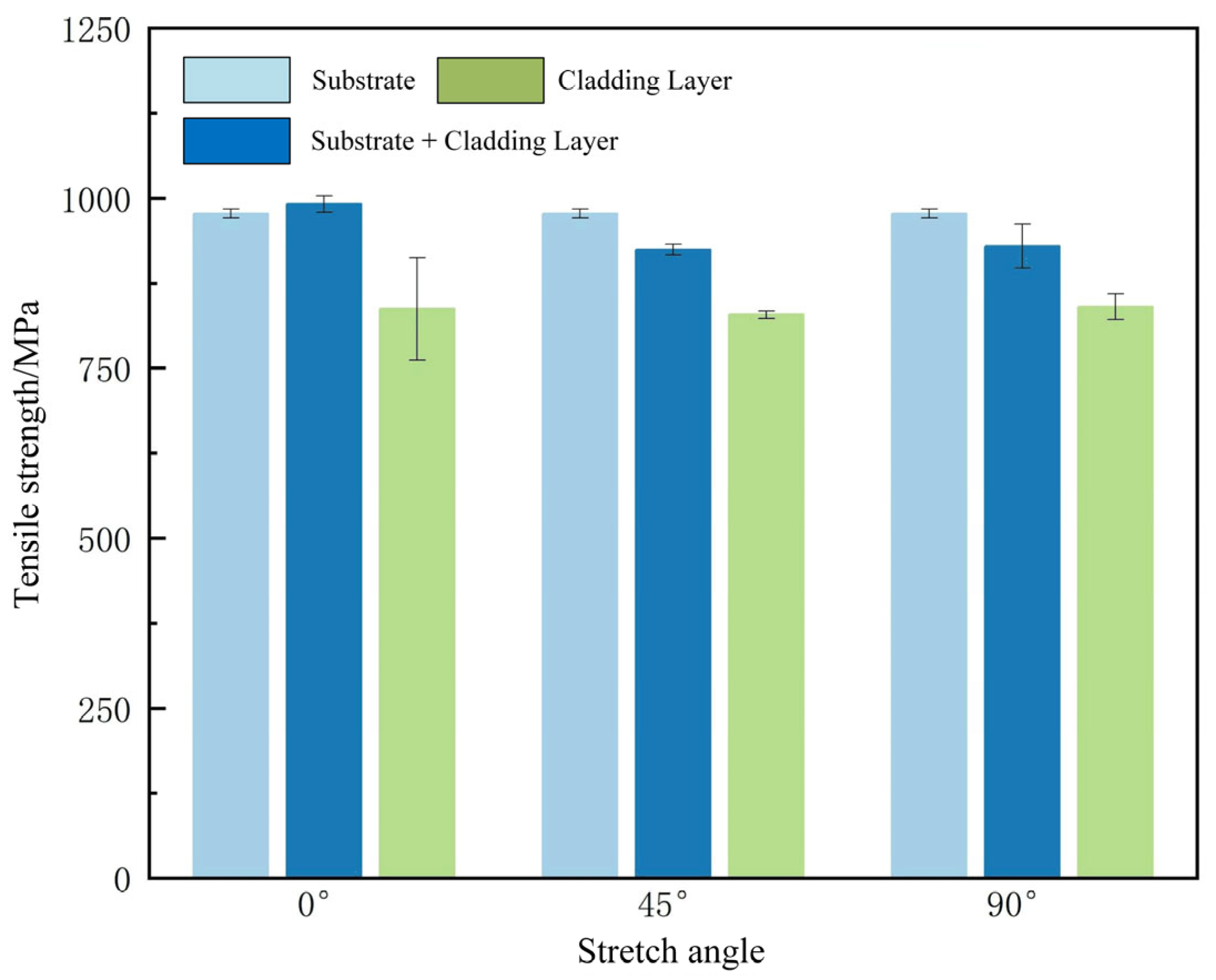 Figure 17. The average tensile strengths of the cladding layer at different angles were 977.31 MPa, 828.69 MPa, and 840.44 MPa, respectively. It can be seen that under the experimental parameters employed, the different angles did not affect the tensile properties of the cladding layer.