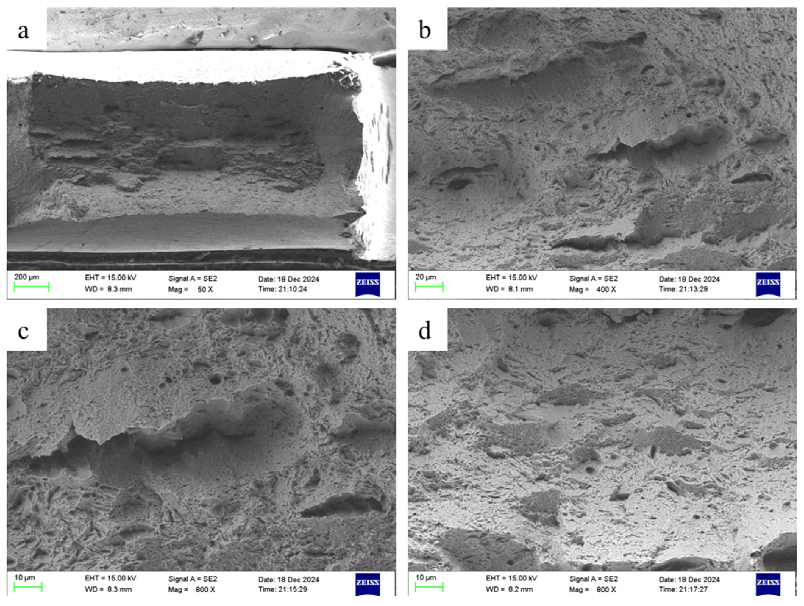 Figure 19b, columnar grains distributed along the cross-section can be observed at the right boundary between the cladding layer and the substrate. Additionally, the laser cladding process caused grains to grow at random angles within the melt pool, resulting in microstructural inhomogeneity within the cladding layer and subsequent uneven stress distribution. Consequently, higher magnification revealed that the cladding layer exhibited a rougher surface texture than the substrate. At the interface between substrate and cladding layer, asynchronous deformation during tensile loading induced dislocations, forming a dislocation crack that traversed both the substrate and cladding layer. At higher magnifications, the clad layer exhibited numerous irregularly shaped pits of varying sizes and depths, interlaced without distinct dendritic patterns—characteristic features of ductile pits. These pits formed through plastic deformation during tensile stress, coupled with the nucleation and growth of micro-voids.
