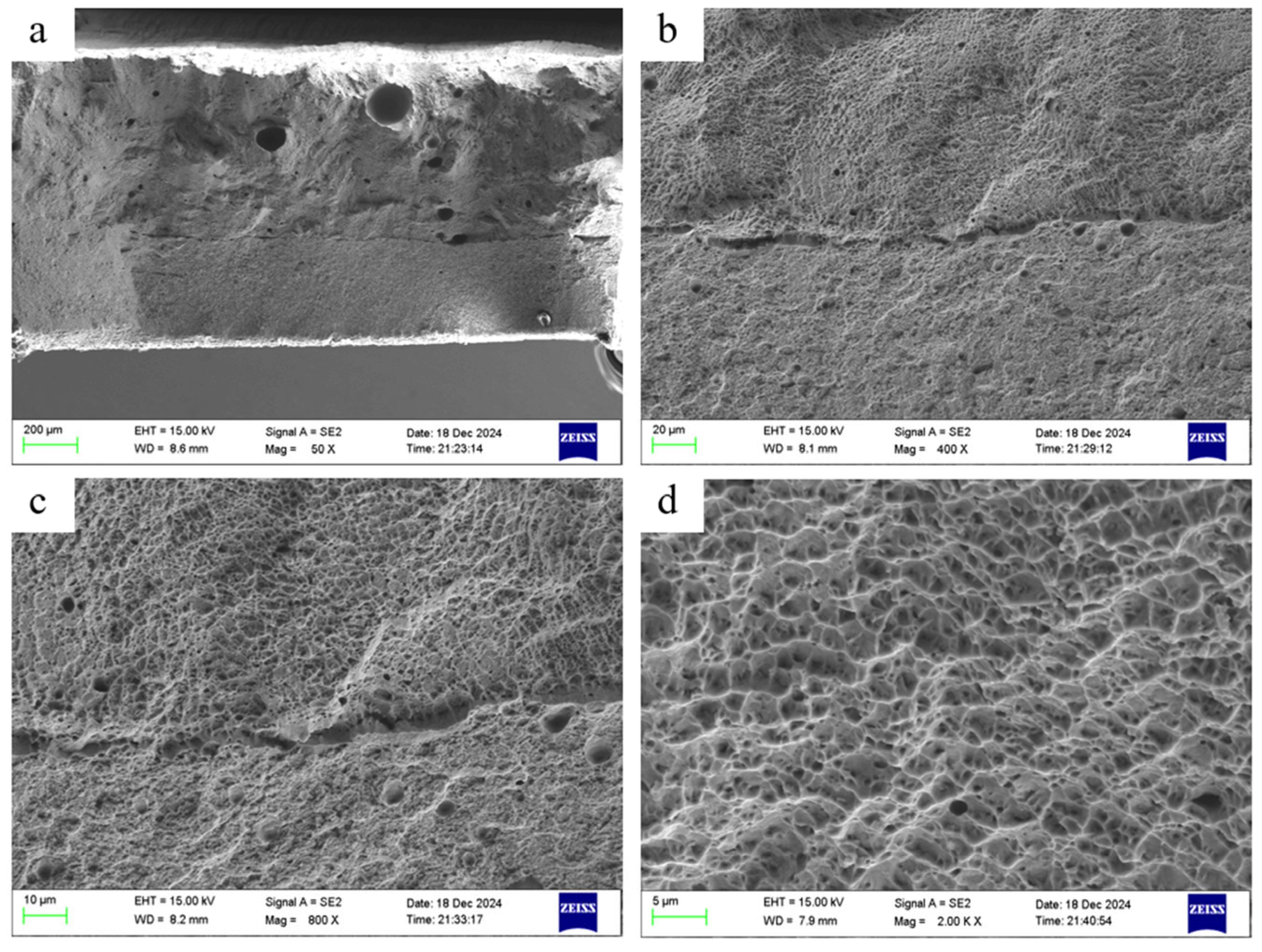 At 50× magnification, the overall fracture morphology was clearly observable. Necking occurs when localized stress concentration causes significant plastic flow at this point after the material reaches its ultimate tensile strength, ultimately resulting in a reduced cross-sectional area. This indicates that the base material possessed sufficient ductility and toughness. The central region, after undergoing substantial strain, experienced localized stress concentration and deformation. This resulted in microscopic plastic flow within the material, creating a wrinkled appearance overall. At 400× magnification, the aforementioned wrinkles in the central area were identified as cracks originating from plastic fracture. The crack propagation path is related to surrounding defects and grain boundaries in the material, likely caused by stress concentration due to internal inclusions or pores.