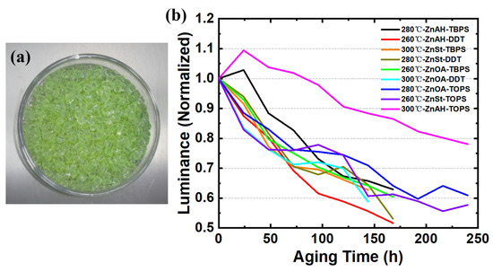Through the design of this orthogonal experiment, the relatively optimal S source, Zn source, and reaction temperature for ZnS shell coating were successfully found to be TOP-S, ZnAH, and 300 °C, respectively. Among them, the condition combination of Experiment B9 is the optimal core synthesis parameter in this orthogonal experiment. It can also be clearly seen from the results of the double-85 aging test in