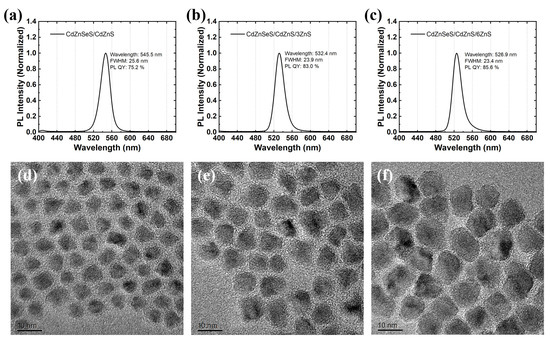 Figure 2a–c that the PL wavelengths of QDs without ZnS shell, with three times amount of ZnS shell, and with six times amount of ZnS shell are 545.5 nm, 532.4 nm, and 526.9 nm, respectively. With the increase in the shell, the wavelength further blue shifts due to element diffusion; the PL FWHMs are 25.6 nm, 23.9 nm, and 23.4 nm, respectively, which gradually narrow with the shell coating, indicating that the degree of alloying tends to be consistent and the band gap difference between QDs decreases [