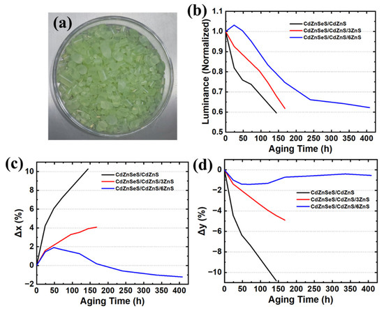 Figure 3b–d show the changes in brightness, x chromaticity coordinate, and y chromaticity coordinate of the three types of QDs during the entire aging process. From the changes in the three optical parameters, the QDs with thicker shells have slower brightness decay and smaller xy chromaticity coordinate drift, indicating that the physical barrier effect of the shell is enhanced, and water and oxygen are difficult to penetrate into the core, thus improving stability [