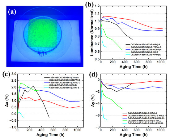 Figure 4b–d show the changes in brightness, x chromaticity coordinate, and y chromaticity coordinate of the five types of QDs during the entire aging process. From the changes in the three optical parameters, phosphonic acid ligands, such as TDPA and ODPA, can significantly improve the stability of QDs, reduce brightness decay and color drift during aging. This should be attributed to the stronger coordination ability and higher boiling point of phosphonic-acid ligands, which make QDs not easy to desorb during high-temperature mixing and extrusion (200 °C) and long-term aging (85 °C), continuously covering the QD surface, avoiding the exposure of defect states, and thus reducing brightness decay caused by non-radiative recombination [