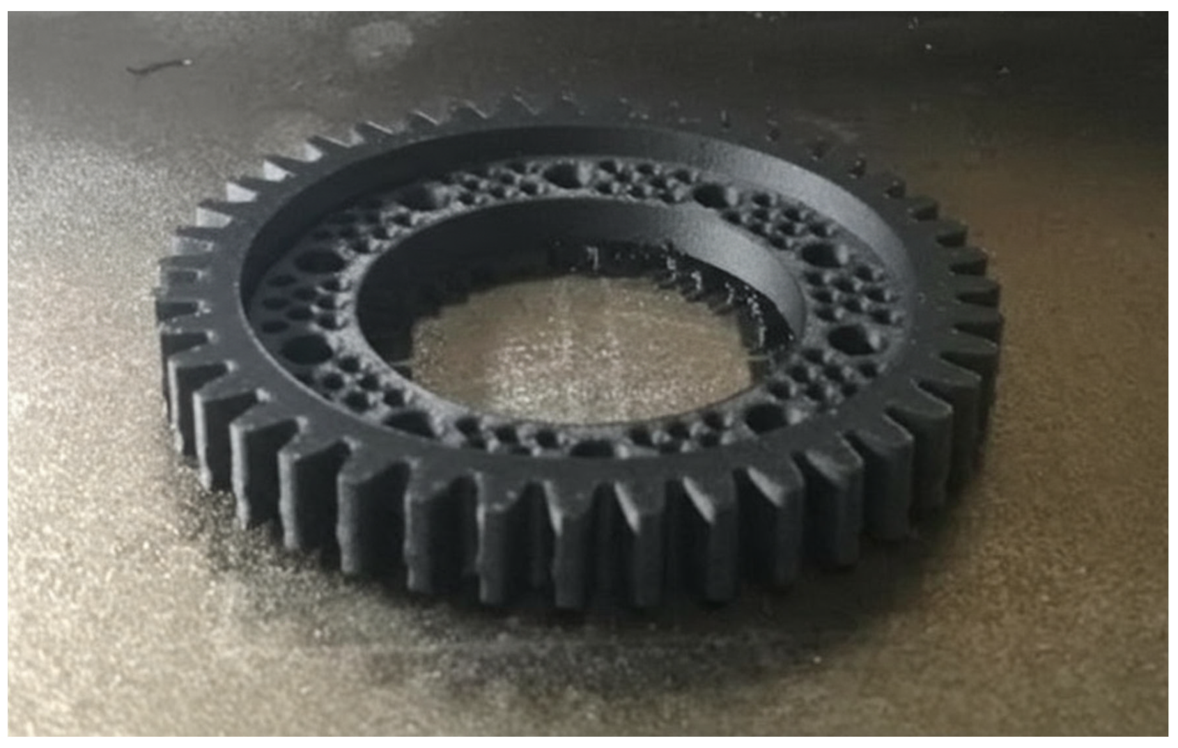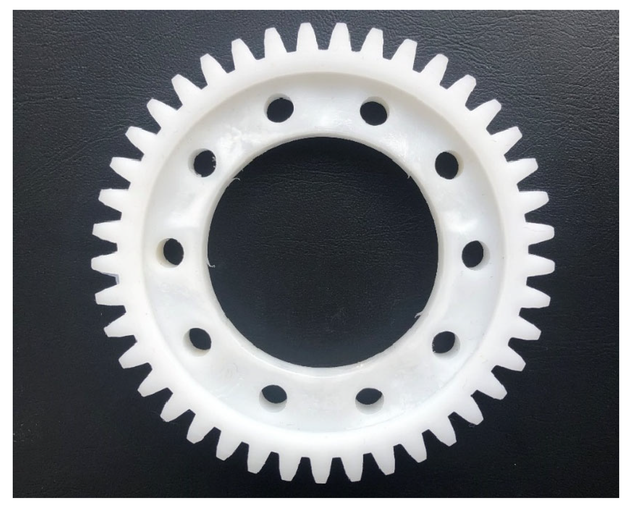 The performed optimization of the volume of the prototype gear geometry would not be economically justified for production using injection molding technology. Adding 80 holes would increase the cost of the injection mold to such an extent that the reduced material expenditure and associated capital savings would not be able to cover the investment in dies.