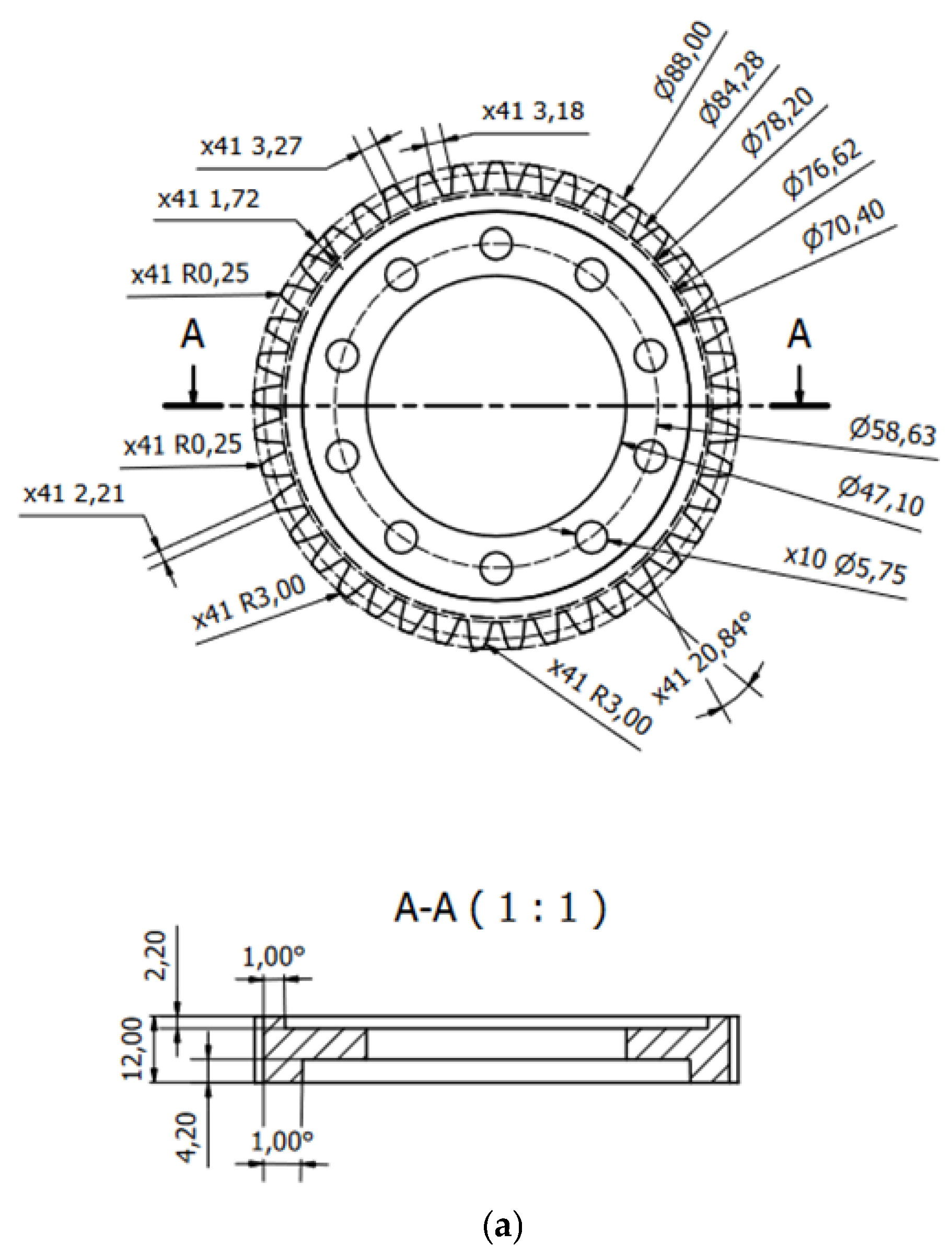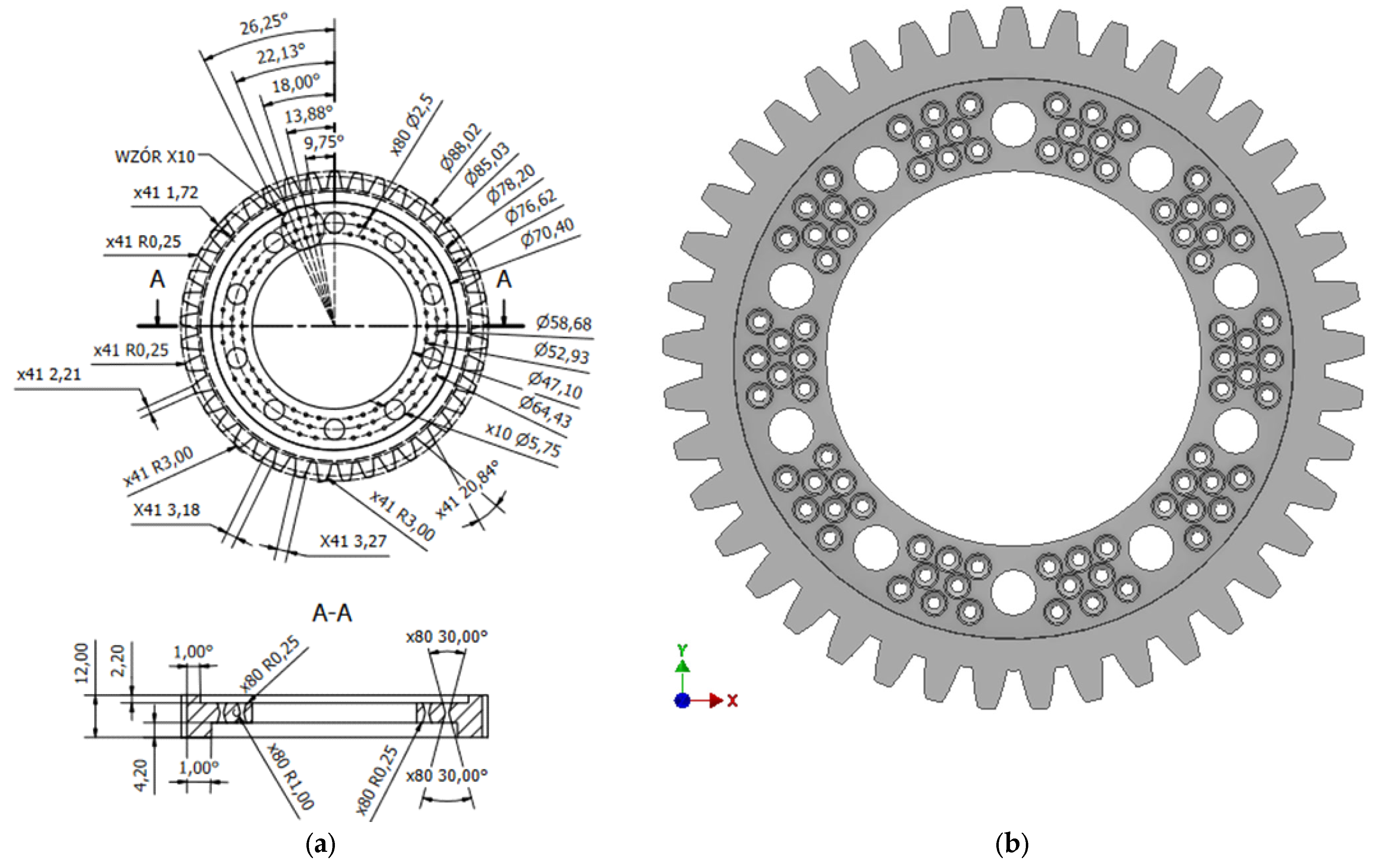 - Banaszek, J.; Jonak, J. Podstawy Konstrukcji Maszyn—Wprowadzenie do Projektowania Przekładni Zębatych i Doboru Sprzęgieł Mechanicznych; Wydawnictwo Politechniki Lubelskiej: Lublin, Poland, 2008. [Google Scholar]