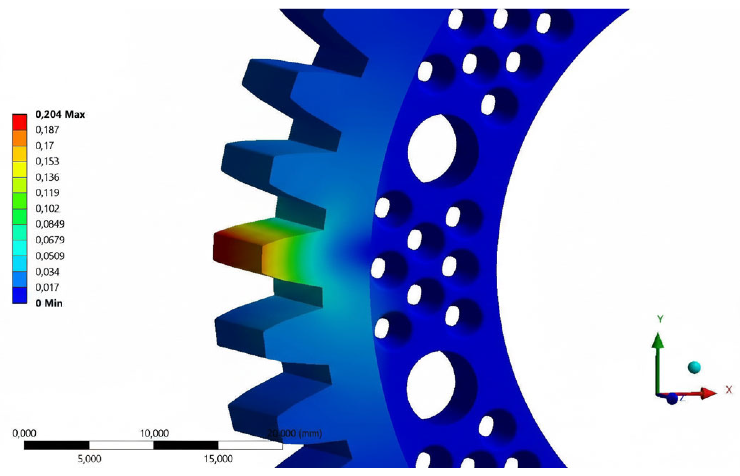 The results obtained during the first analysis in comparison with the material data, showed the possibility of increasing the value of the loading force. Based on the material tables, the yield strength of the POM material is in the range of 60 to 70 MPa. Taking into account the safety factor of 80%, the stresses reduced during the analysis can reach the limit of 48 MPa (for a yield strength of 60 MPa). After trial analyses, the value of the safe static load for further calculations was assumed to be 600 N. The analysis of the base model was repeated for total strain and reduced stress. The total strain results of the loaded tooth geometry were used as a reference for the process of designing a prototype gear intended for the manufacturing process using 3D printing technology.