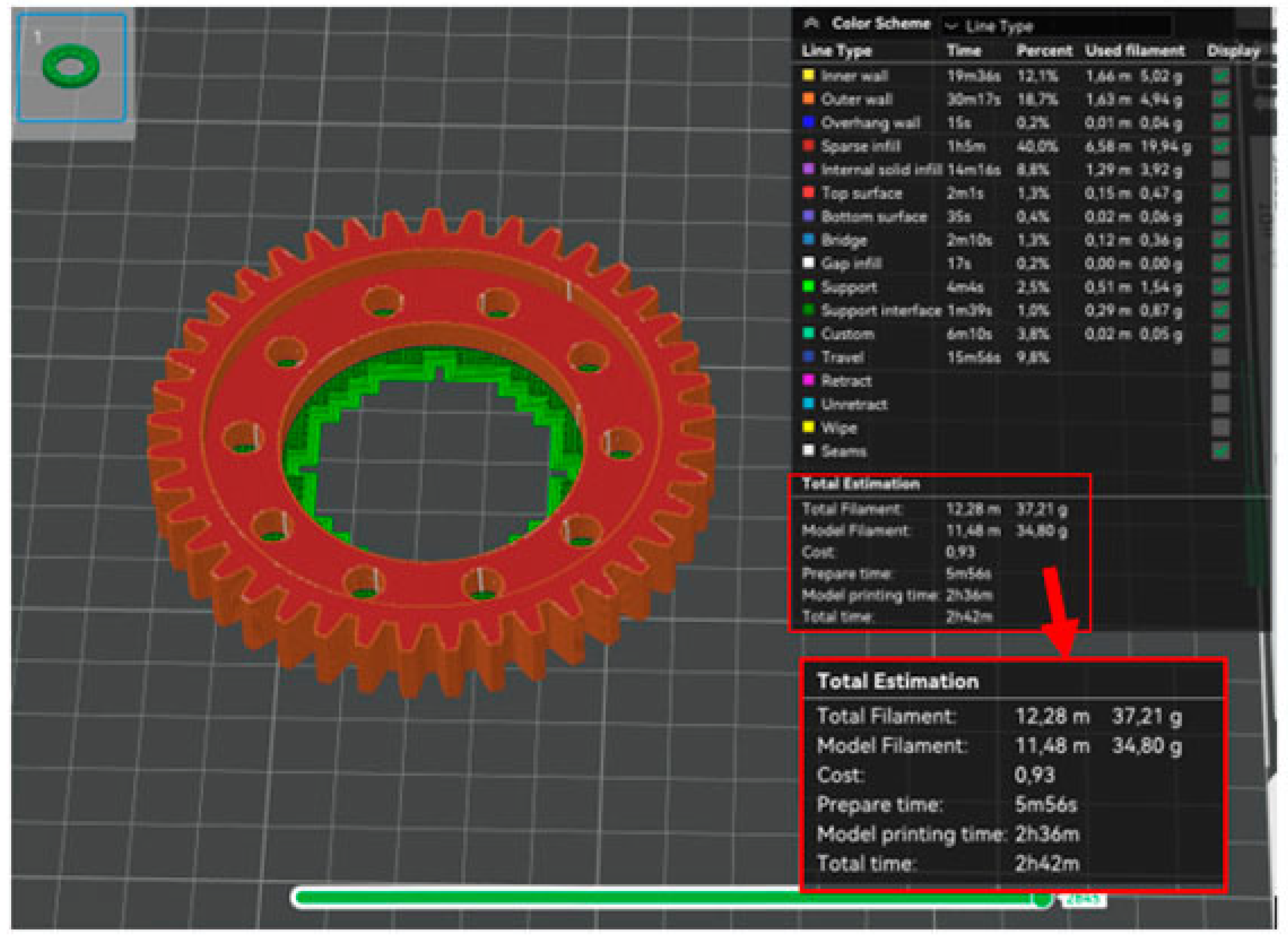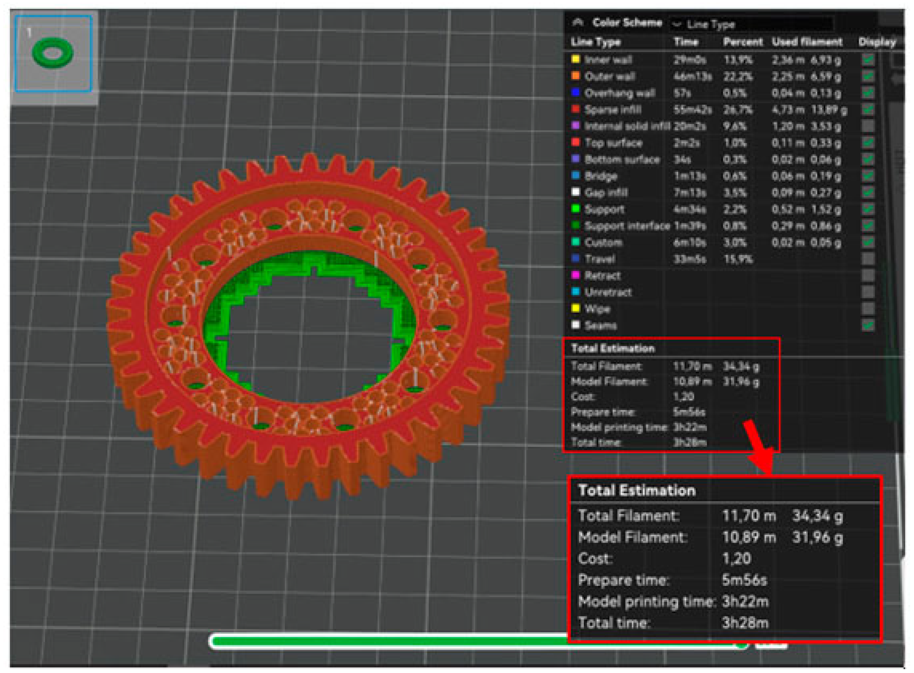 Table 2 contains a summary of the volume, weight and printing time of the analyzed product