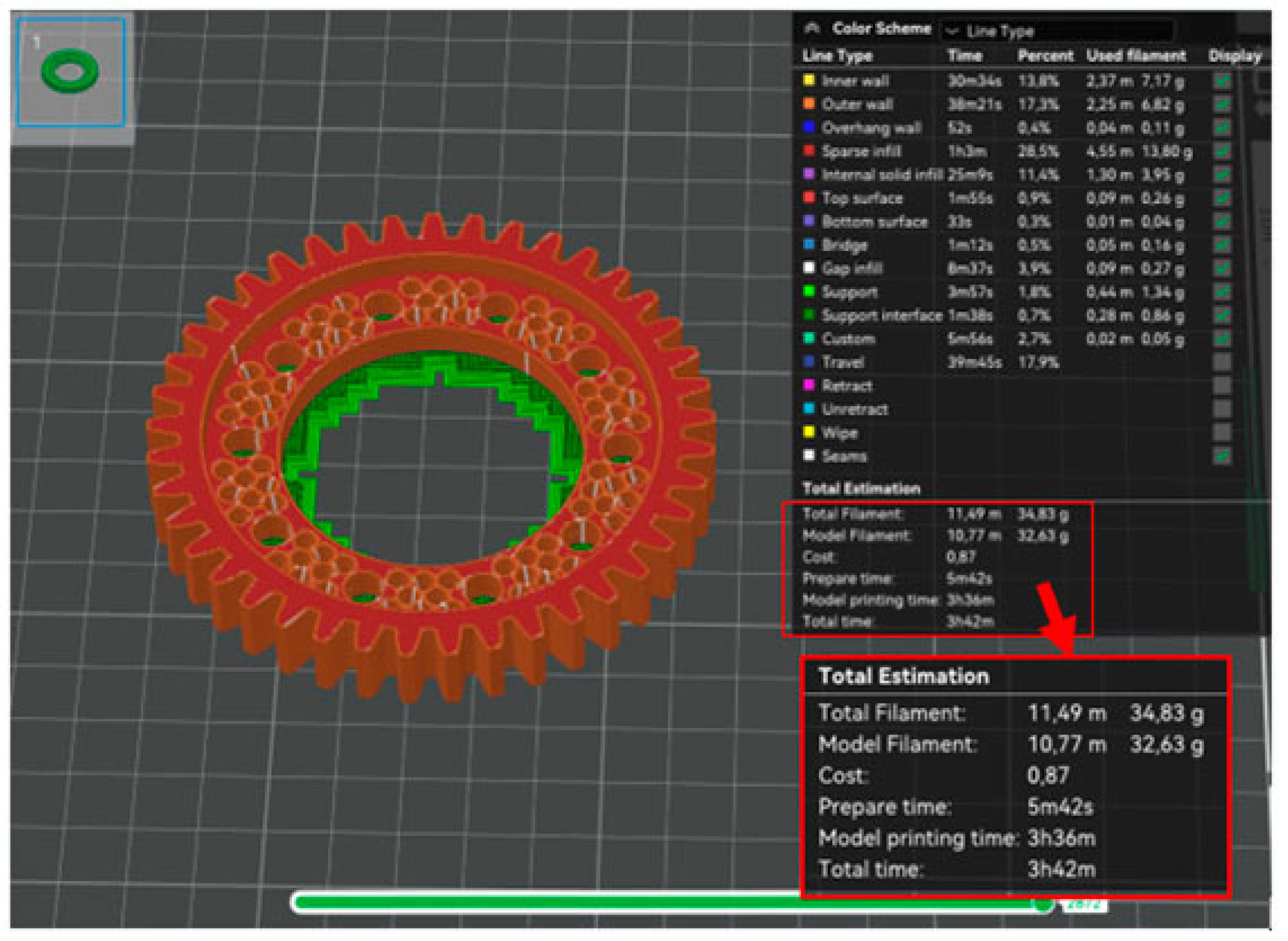 The obtained results of numerical simulations confirmed the validity of performing this type of testing before the production of prototype parts. Based on these, of the four nominated materials, only two were approved for further production: PLA and PA6. The ABS material was rejected for two reasons: the threshold of 10% discrepancy of the maximum values of the total deformation of the tooth geometry was exceeded, and the maximum values of the reduced stresses exceeded the yield strength of the material, as a result of which the deformation of the tooth geometry would be fixed. Based on the results obtained, the PA12 material was rejected due to an increase of more than 100% in the values of maximum total deformation. In such a situation, it is reasonable to assume that teeth jump between each other during increased loading, which is categorically unacceptable. Conducting numerical analyses has significantly saved the potential capital provided for purchasing the materials and shortened the time required to print the parts. In addition, analysis of the results obtained for the qualified materials made it possible to define the first choice material, which was PLA. The gear made of PLA achieved the best strength properties; this material is biodegradable and is one of the cheapest on the market.