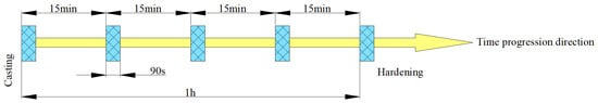 Penetration resistance was adopted as the division criterion because it quantitatively characterizes the hydration process, ensuring comparability between different batches. According to the Standard for test method of performance on ordinary fresh concrete (GB/T 50080-2016) [], the setting time of the concrete was determined. The times corresponding to penetration resistances of 3.5 MPa and 28 MPa were recorded as the initial and final setting times. Based on the preliminary test results, the initial and final setting times of the concrete used in this study were 465 min and 690 min, respectively. Detailed vibration conditions for each case are summarized in Table 3.