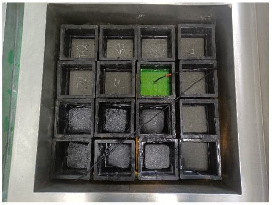 According to the JTG 3420-2020 standard, the rapid freeze–thaw method was used to evaluate the frost resistance of concrete. Concrete specimens with dimensions of 100 mm × 100 mm × 400 mm were prepared and tested for freeze–thaw resistance after 28 days of curing, as shown in Figure 5. Each freeze–thaw cycle lasted 4 h, and the mass and dynamic elastic modulus (A dynamic slump tester manufactured by Tianjin Lewei Co., Ltd., China) of the specimens were measured every 25 cycles. The test stops if the relative dynamic elastic modulus falls below 60% or the mass loss rate exceeds 5%. Otherwise, the test continues until 200 freeze–thaw cycles are completed. Three specimens were prepared for each group, and the measured value was taken as the arithmetic mean of the three specimens. The calculation methods for mass loss rate and relative dynamic elastic modulus are shown in Equations (2) and (3):