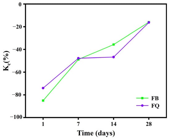 The compressive strength of concrete under different vibration methods is shown in Figure 9. Vibration during the setting and hardening period significantly increased the early compressive strength of the concrete. At 1 day age, the compressive strength of groups FQ and FB increased by 85.1% and 74.6%, respectively, compared to group F. As the curing age increased, the compressive strength of all groups improved significantly, but the differences gradually decreased. At 28 days age, the compressive strength of groups FQ and FB was 16.1% and 16.2% higher than that of group F, indicating that the effect of early vibration on compressive strength gradually weakens with time. The disturbance coefficient of compressive strength for different vibration methods is shown in Figure 10 (The smaller the absolute value of the disturbance coefficient, the smaller the strength difference between the test group and the control group). With increasing age, the disturbance coefficient shows different trends for each vibration method. At 1 day age, the disturbance coefficient is significantly negative. As the curing age increases, the disturbance coefficient gradually decreases.